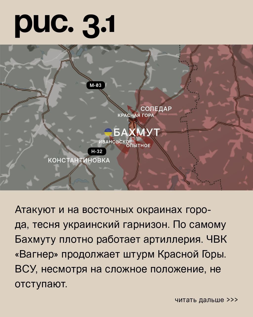 К юго-западу от Бахмута ЧВК «Вагнер» продолжила штурмовые действия вблизи Ивановского. От стратегического населённого пункта «оркестрантов» отделяет около двух километров. Также они продвигаются с юга со стороны Опытного. Атакуют и на восточных окраинах города, тесня украинский гарнизон. По самому Бахмуту плотно работает артиллерия. ЧВК «Вагнер» продолжает штурм Красной Горы. ВСУ, несмотря на сложное положение, не отступают. А вот к северу от Соледара «музыканты» установили контроль над Николаевкой. И наступают вдоль автомобильной трассы и железнодорожной ветки на Роздоловку и Переездное, приближаясь с юга к Северску. К востоку от этого города Вооружённые Силы РФ вновь попытались прорваться в районе Спорного. (Рис. 3)