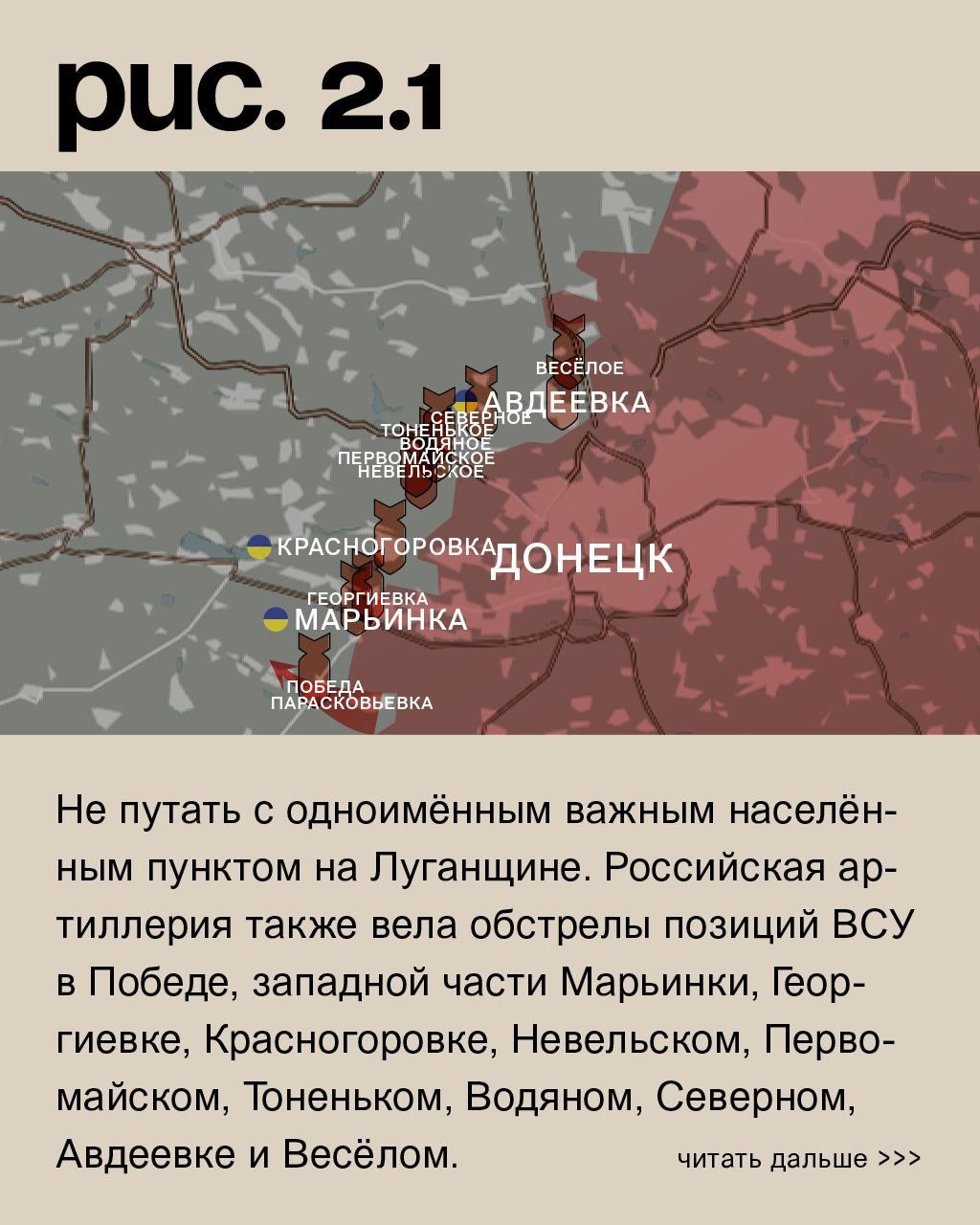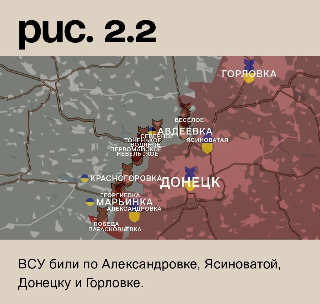 На донецком фронте российские войска нашли новое направление атаки. Чуть северо-западнее Новомихайловки, где они долгое время не могут достичь успеха, Вооружённые Силы РФ предприняли наступательные действия на Парасковьевку. Не путать с одноимённым важным населённым пунктом на Луганщине. Российская артиллерия также вела обстрелы позиций ВСУ в Победе, западной части Марьинки, Георгиевке, Красногоровке, Невельском, Первомайском, Тоненьком, Водяном, Северном, Авдеевке и Весёлом. ВСУ били по Александровке, Ясиноватой, Донецку и Горловке. (Рис. 2)