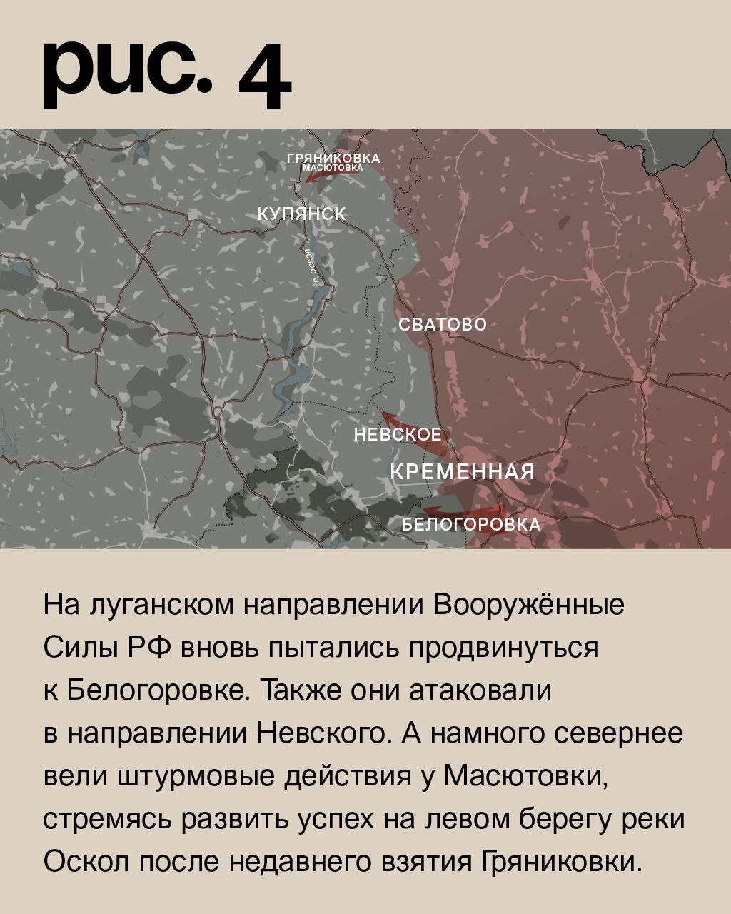 На луганском направлении Вооружённые Силы РФ вновь пытались продвинуться к Белогоровке. Также они атаковали в направлении Невского. А намного севернее вели штурмовые действия у Масютовки, стремясь развить успех на левом берегу реки Оскол после недавнего взятия Гряниковки. (Рис. 4)