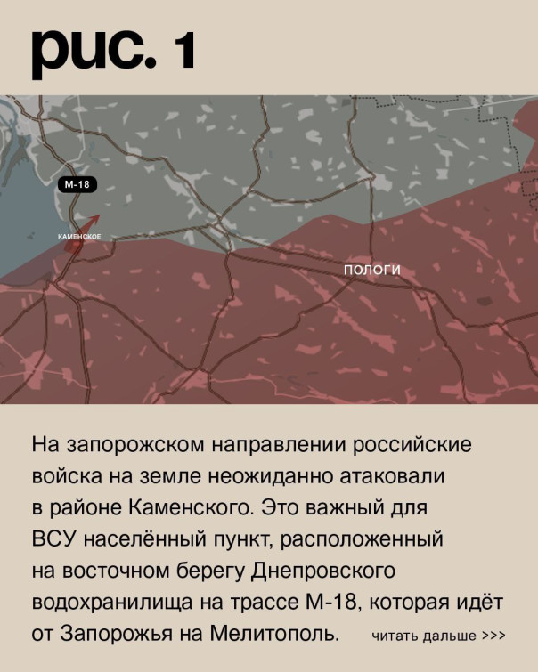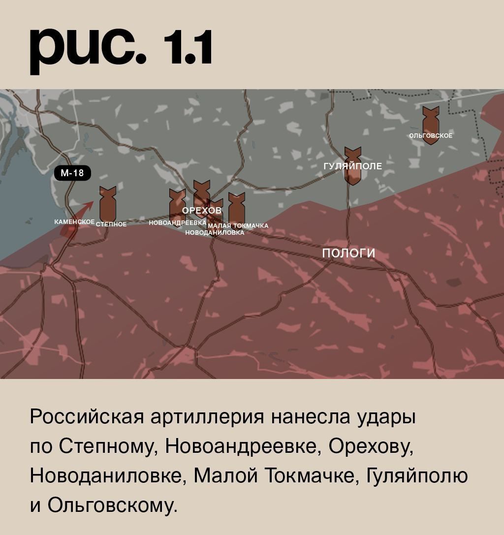 На запорожском направлении российские войска на земле неожиданно атаковали в районе Каменского. Это важный для ВСУ населённый пункт, расположенный на восточном берегу Днепровского водохранилища на трассе М-18, которая идёт от Запорожья на Мелитополь. Российская артиллерия нанесла удары по Степному, Новоандреевке, Орехову, Новоданиловке, Малой Токмачке, Гуляйполю и Ольговскому. (Рис. 1)