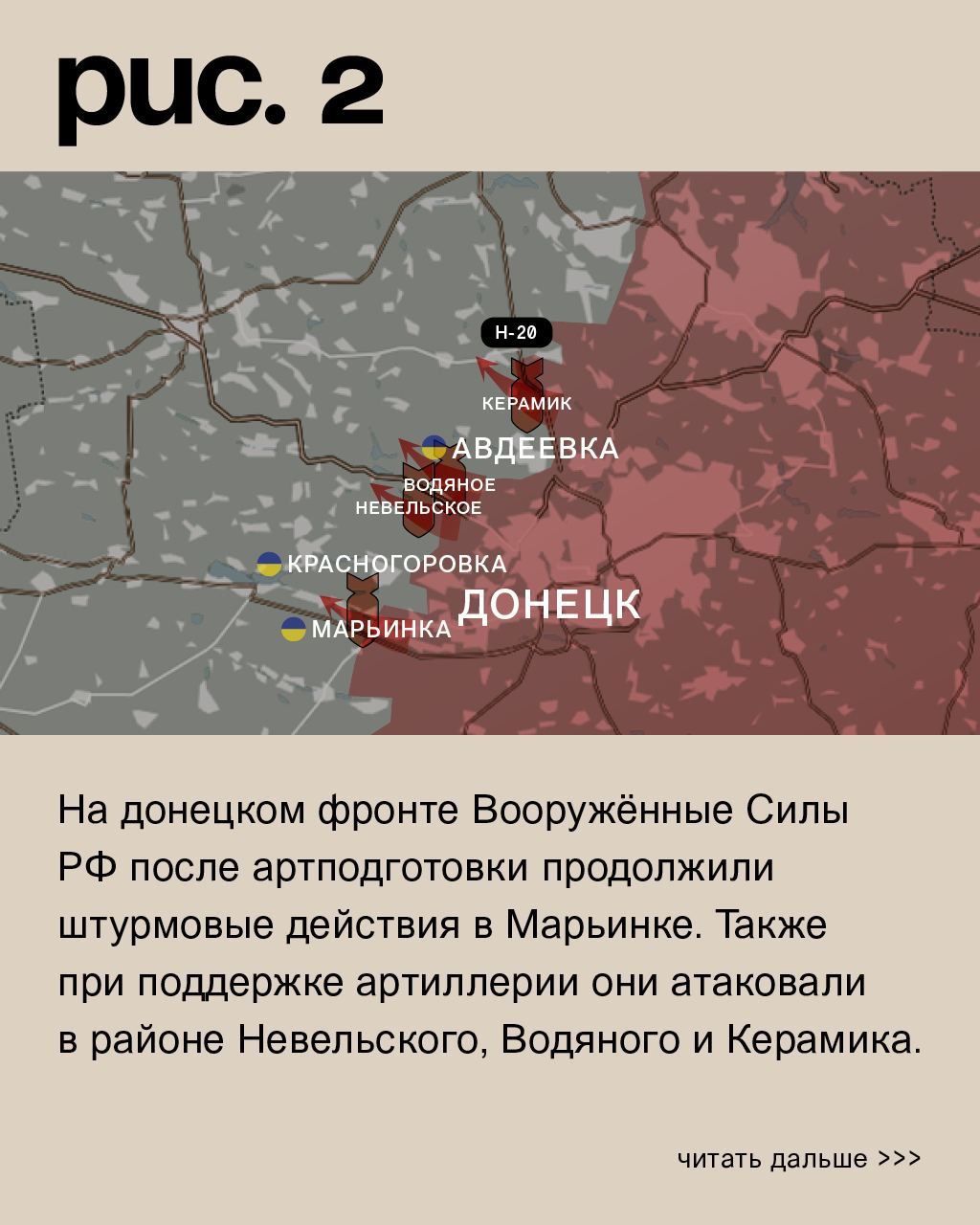 На донецком фронте Вооружённые Силы РФ после артподготовки продолжили штурмовые действия в Марьинке. Также при поддержке артиллерии они атаковали в районе Невельского, Водяного и Керамика. В направлении последнего из названных населённых пунктов есть небольшое продвижение к участку трассы Н-20. Российская артиллерия также била по Георгиевке, Красногоровке, Авдеевке и Нью-Йорку. ВСУ нанесли удары по Донецку и Макеевке. (Рис. 2)