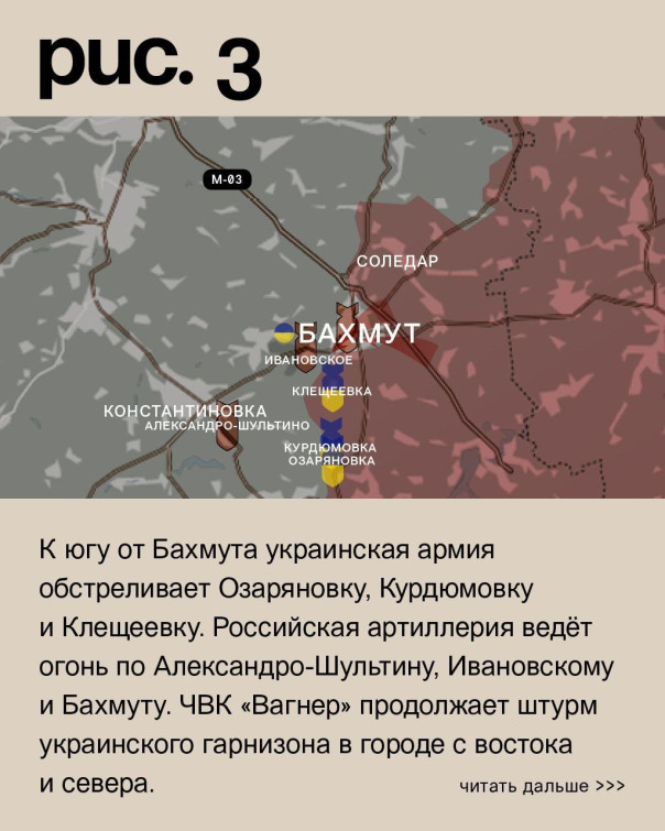 К югу от Бахмута украинская армия обстреливает Озаряновку, Курдюмовку и Клещеевку. Российская артиллерия ведёт огонь по Александро-Шультину, Ивановскому и Бахмуту. ЧВК «Вагнер» продолжает штурм украинского гарнизона в городе с востока и севера. Юго-западнее Красной Горы «оркестранты» продвинулись у Берховки. Также они атакуют у Дубово-Васильевки. К северо-западу от Соледара ЧВК «Вагнер» при огневой поддержке пытается прорваться к Васюковке. Российская артиллерия ведёт обстрел Железнянского, Фёдоровки, Роздоловки, Весёлого и Спорного. (Рис. 3)