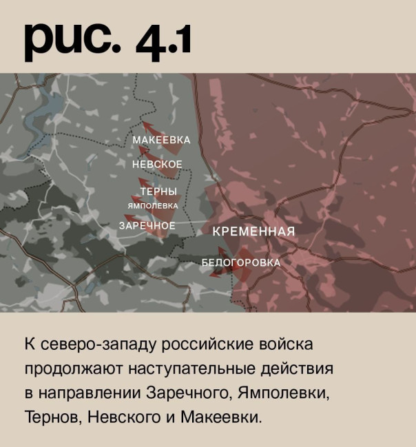 На луганском направлении подразделения Вооружённых Сил РФ атаковали позиции ВСУ в Белогоровке с юга и северо-востока. Двойной удар, тем не менее, не принёс им желаемого результата. К северо-западу российские войска продолжают наступательные действия в направлении Заречного, Ямполевки, Тернов, Невского и Макеевки. (Рис. 4)
