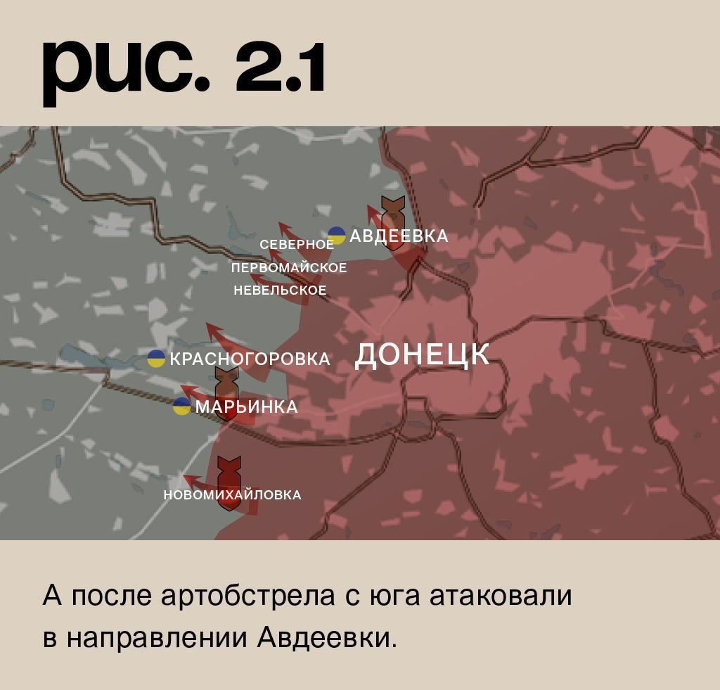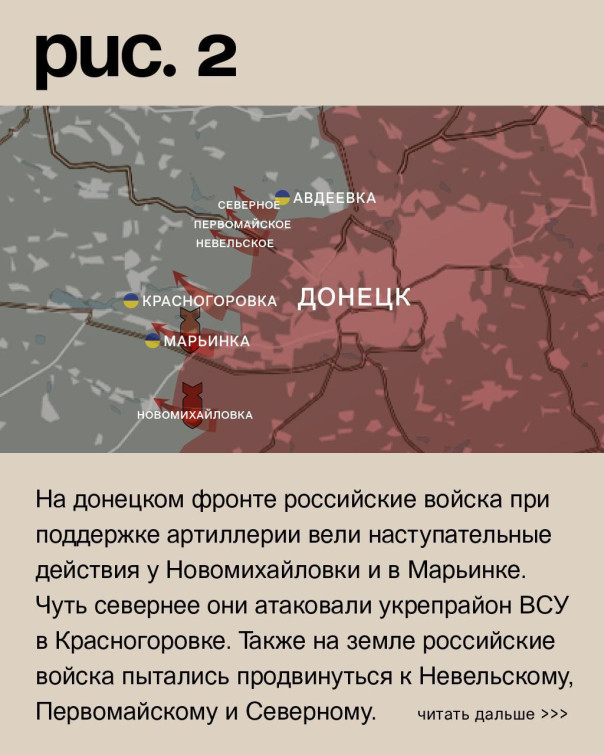 На донецком фронте российские войска при поддержке артиллерии вели наступательные действия у Новомихайловки и в Марьинке. Чуть севернее они атаковали укрепрайон ВСУ в Красногоровке. Также на земле российские войска пытались продвинуться к Невельскому, Первомайскому и Северному. А после артобстрела с юга атаковали в направлении Авдеевки. (Рис. 2)