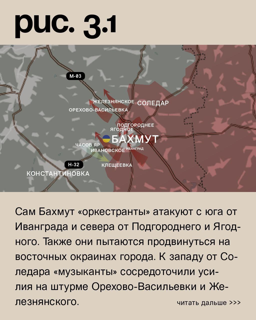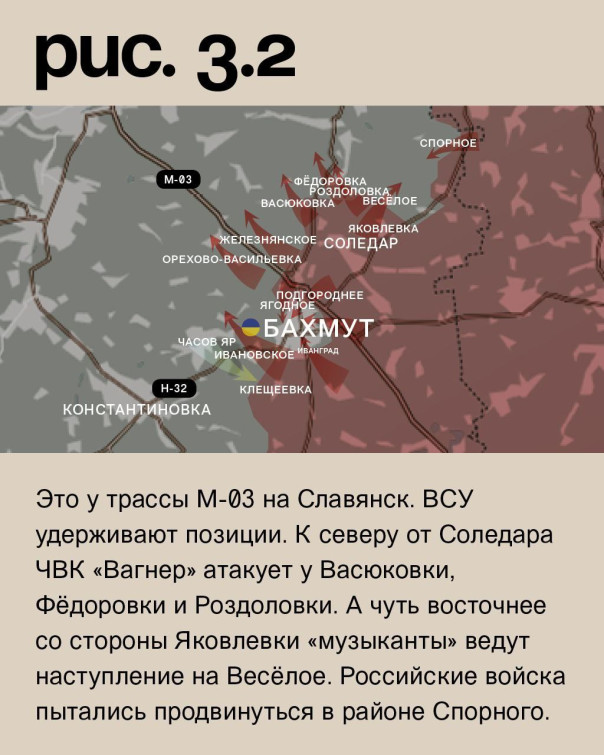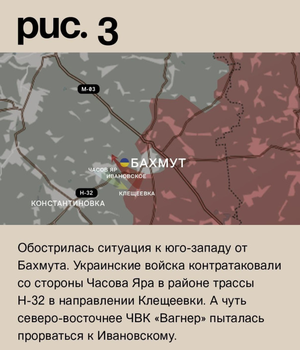 Обострилась ситуация к юго-западу от Бахмута. Украинские войска контратаковали со стороны Часова Яра в районе трассы Н-32 в направлении Клещеевки. А чуть северо-восточнее ЧВК «Вагнер» пыталась прорваться к Ивановскому. Сам Бахмут «оркестранты» атакуют с юга от Иванграда и севера от Подгороднего и Ягодного. Также они пытаются продвинуться на восточных окраинах города. К западу от Соледара «музыканты» сосредоточили усилия на штурме Орехово-Васильевки и Железнянского. Это у трассы М-03 на Славянск. ВСУ удерживают позиции. К северу от Соледара ЧВК «Вагнер» атакует у Васюковки, Фёдоровки и Роздоловки. А чуть восточнее со стороны Яковлевки «музыканты» ведут наступление на Весёлое. Российские войска пытались продвинуться в районе Спорного. (Рис. 3)