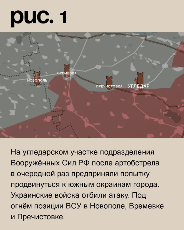 На угледарском участке подразделения Вооружённых Сил РФ после артобстрела в очередной раз предприняли попытку продвинуться к южным окраинам города. Украинские войска отбили атаку. Под огнём позиции ВСУ в Новополе, Времевке и Пречистовке. (Рис. 1)