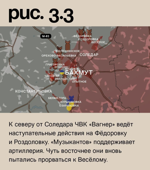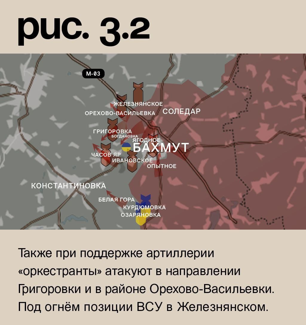 К югу от Бахмута украинская артиллерия била по Озаряновке и Курдюмовке. ЧВК «Вагнер» атаковала в направлении Белой Горы и Часова Яра. По последнему из названных населённых пунктов работала артиллерия. Также под обстрелом Ивановское и сам Бахмут. «Музыканты» продвинулись в городской черте со стороны Опытного, а также с восточных окраин ближе к центру. А с севера – от Ягодного. К северо-западу от Бахмута ЧВК «Вагнер» вышла к Богдановке. Также при поддержке артиллерии «оркестранты» атакуют в направлении Григоровки и в районе Орехово-Васильевки. Под огнём позиции ВСУ в Железнянском. К северу от Соледара ЧВК «Вагнер» ведёт наступательные действия на Фёдоровку и Роздоловку. «Музыкантов» поддерживает артиллерия. Чуть восточнее они вновь пытались прорваться к Весёлому. (Рис. 3)