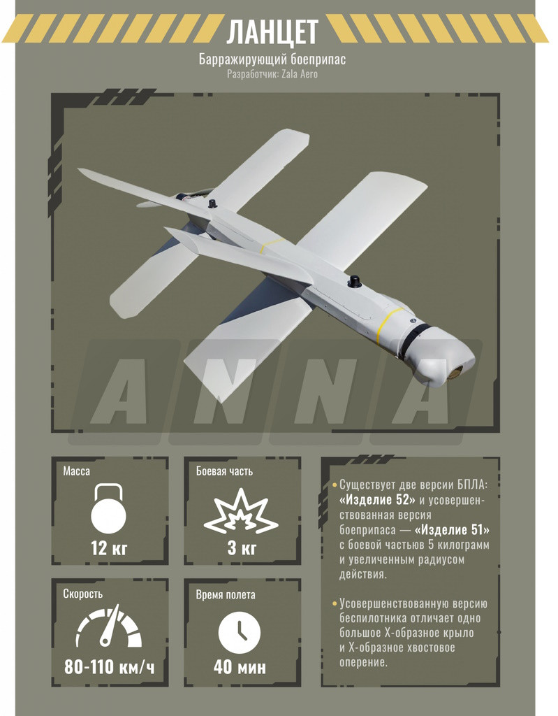 «Ланцет»доказали свою эффективность в боевых условиях, сумев поразить десятки различных целей ВСУ в виде ЗРК, САУ, артиллерийских орудий, РЛС и легкой бронетехники. Источник