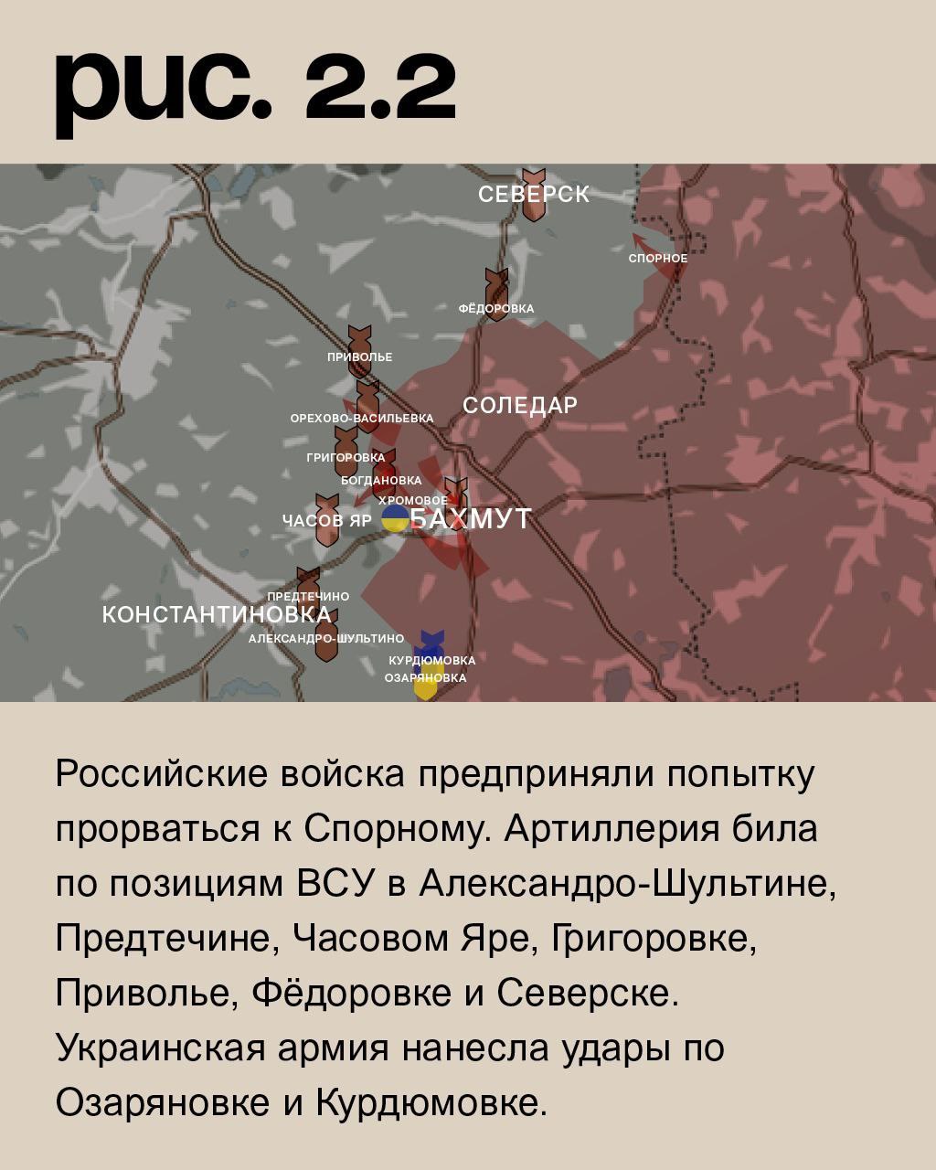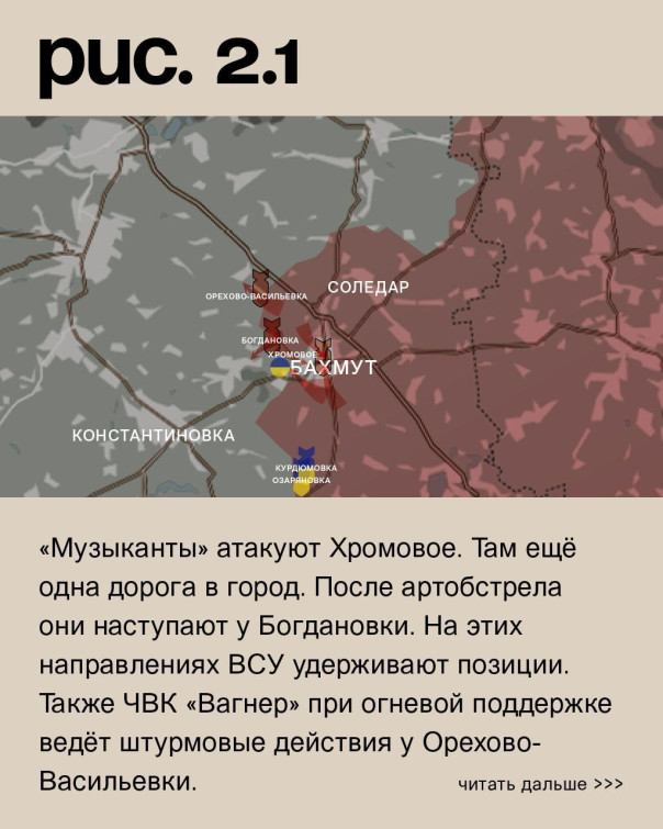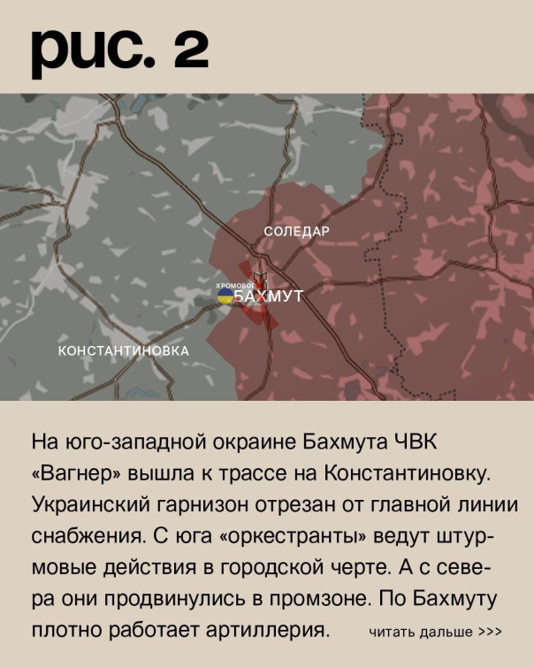 На юго-западной окраине Бахмута ЧВК «Вагнер» вышла к трассе на Константиновку. Украинский гарнизон отрезан от главной линии снабжения. С юга «оркестранты» ведут штурмовые действия в городской черте. А с севера они продвинулись в промзоне. По Бахмуту плотно работает артиллерия. «Музыканты» атакуют Хромовое. Там ещё одна дорога в город. После артобстрела они наступают у Богдановки. На этих направлениях ВСУ удерживают позиции. Также ЧВК «Вагнер» при огневой поддержке ведёт штурмовые действия у Орехово-Васильевки. Российские войска предприняли попытку прорваться к Спорному. Артиллерия била по позициям ВСУ в Александро-Шультине, Предтечине, Часовом Яре, Григоровке, Приволье, Фёдоровке и Северске. Украинская армия нанесла удары по Озаряновке и Курдюмовке. (Рис. 2)