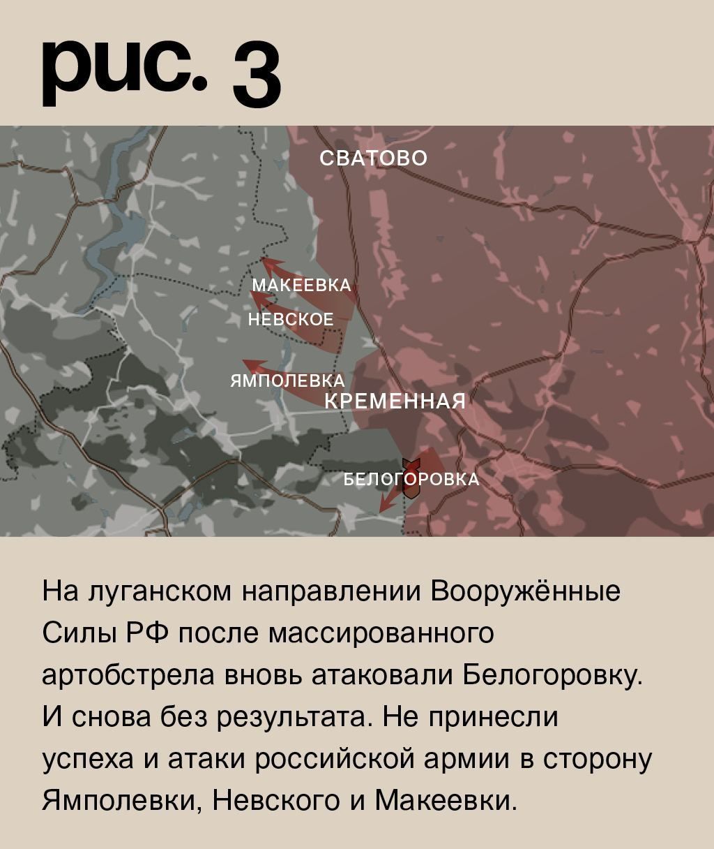 На луганском направлении Вооружённые Силы РФ после массированного артобстрела вновь атаковали Белогоровку. И снова без результата. Не принесли успеха и атаки российской армии в сторону Ямполевки, Невского и Макеевки. (Рис. 3)