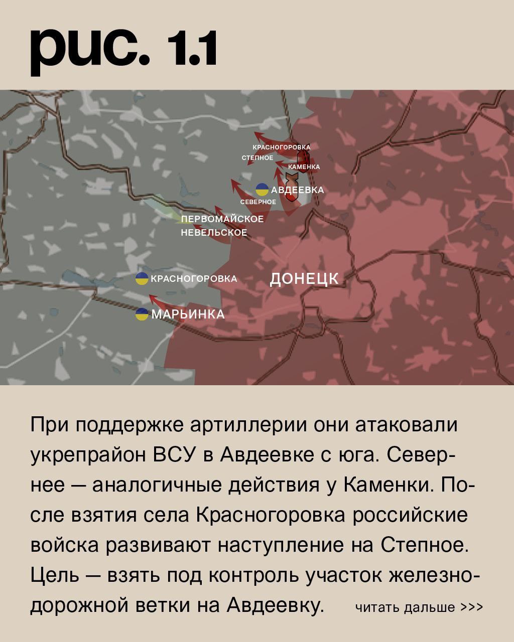 На донецком фронте российские войска ведут штурмовые действия на северных окраинах Марьинки. У Невельского шли встречные бои. Вооружённые Силы РФ вновь попытались продвинуться к Первомайскому и Северному. Без успеха. При поддержке артиллерии они атаковали укрепрайон ВСУ в Авдеевке с юга. Севернее – аналогичные действия у Каменки. После взятия села Красногоровка российские войска развивают наступление на Степное. Цель – взять под контроль участок железнодорожной ветки на Авдеевку. Вооружённые Силы РФ вели обстрелы Победы, Георгиевки, Тоненького, Ласточкина и Новокалинового. Украинская армия нанесла удар по Александровке. (Рис. 1)