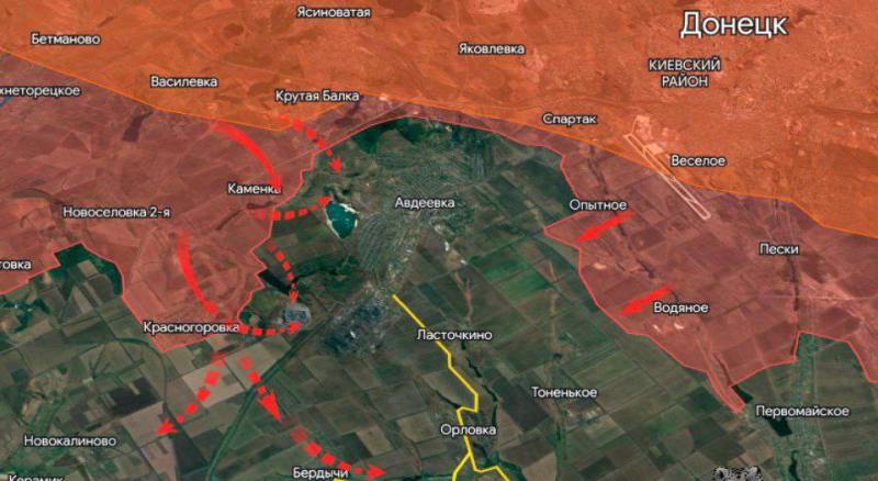 Также наши части закрепляются в Каменке. Бойцам ВС РФ удалось прорваться и на юге от Авдеевки: в той части бои идут непосредственно в окрестностях города. Помимо этого, наша армия осуществляет попытку зайти в город с юго-запада, идет бой в районе ДК Техники и Спорта, а также в 9-м квартале Авдеевки. В случае сохранения темпов наступления ВС РФ в ближайшее время смогут взять этот населенный пункт, как минимум, в тактическое окружение, как максимум – в оперативное. ВСУ экстренно стягивают резервы.