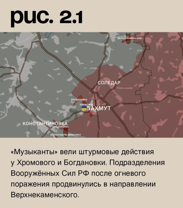 К юго-западу от Бахмута ЧВК «Вагнер» продолжила наступление на Предтечино. Есть продвижение. При поддержке артиллерии «оркестранты» вышли и на юго-западные окраинах самого Бахмута у въезда в город со стороны логистической трассы на Константиновку. «Музыканты» вели штурмовые действия у Хромового и Богдановки. Подразделения Вооружённых Сил РФ после огневого поражения продвинулись в направлении Верхнекаменского. Российская артиллерия наносила удары по Александро-Шультину, Часову Яру, Григоровке, Орехово-Васильевке, Миньковке, Васюковке, Северску и Спорному. (Рис. 2)