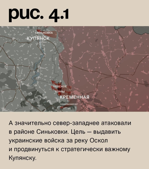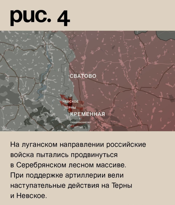 На луганском направлении российские войска пытались продвинуться в Серебрянском лесном массиве. При поддержке артиллерии вели наступательные действия на Терны и Невское. А значительно север-западнее атаковали в районе Синьковки. Цель – выдавить украинские войска за реку Оскол и продвинуться к стратегически важному Купянску. (Рис. 4)