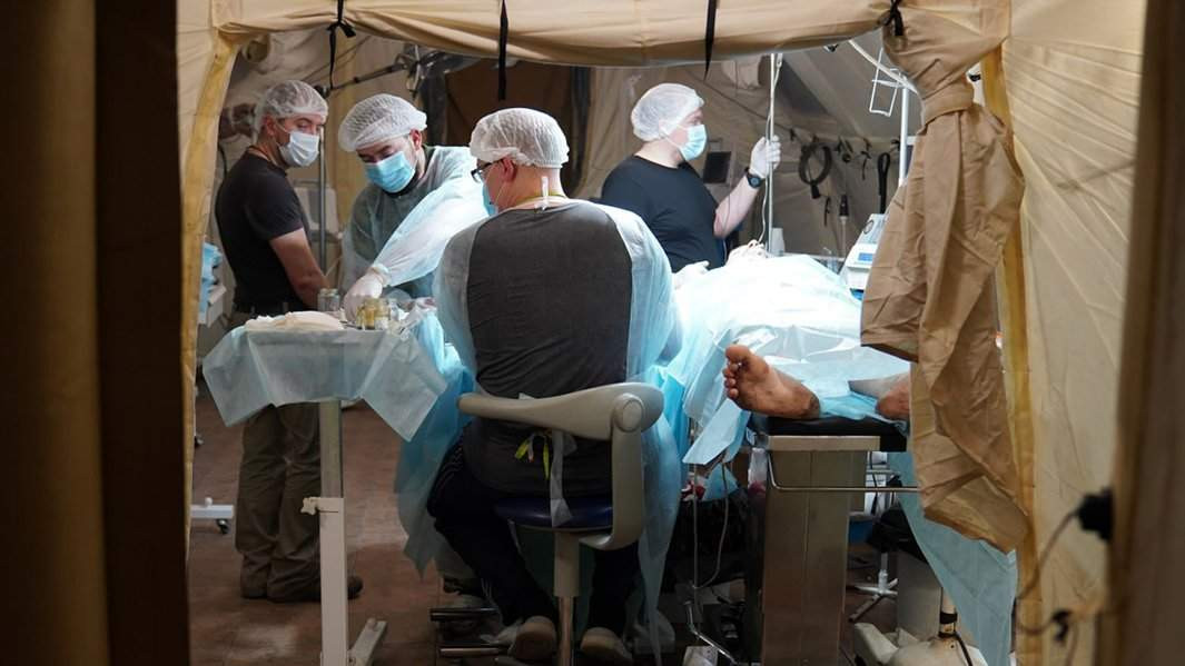 Роль операционной выполняет пневмокаркасная палатка. Рядом — помещение реанимации. Внутри пациент — мужчина лет 50, лежащий с закрытыми глазами с кислородной трубкой у носа, над ним экран с электронными показателями состояния здоровья, кривая кардиограммы.