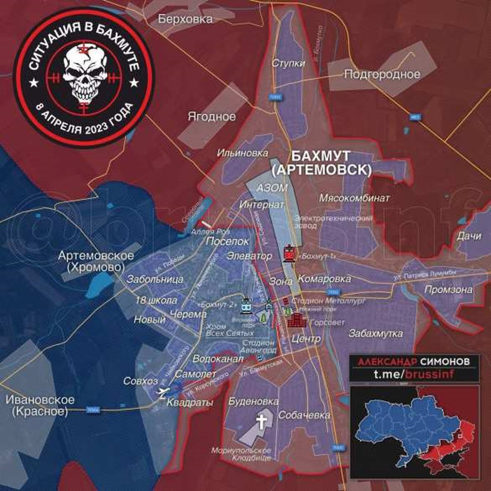 ЧВК «Вагнер» взяли стадион «Металлург» и подошли к улице Кузнечной. Передовые позиции «музыкантов» находятся в районе Верхнего парка. Железнодорожная станция и храм Всех святых пока еще под контролем врага.