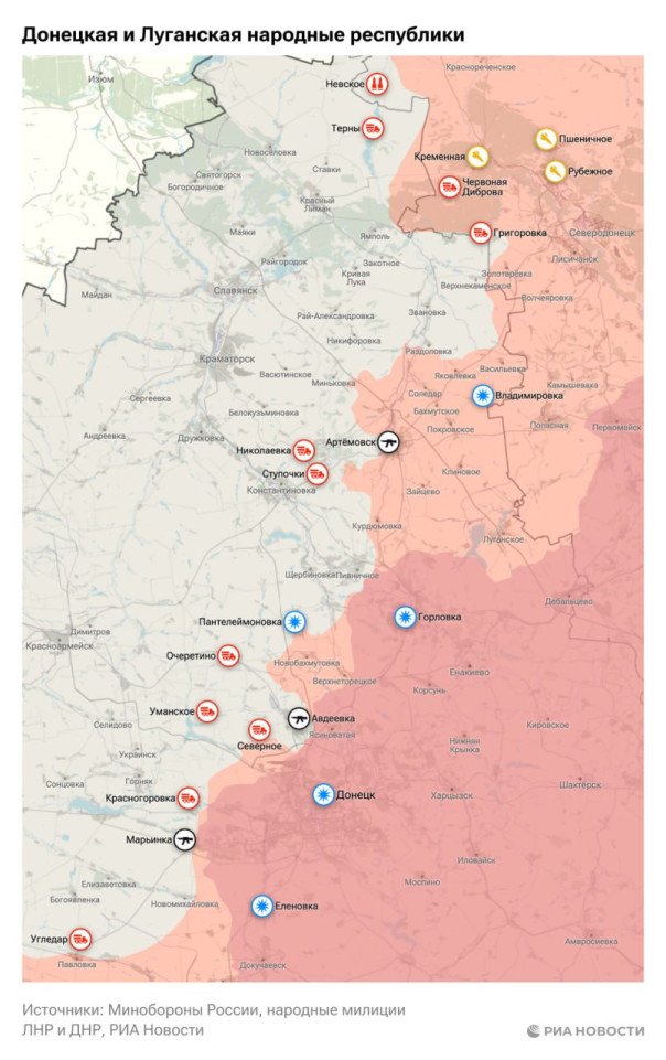● Группировка украинских войск практически блокирована на западных окраинах Артемовска, заявил советник Пушилина Гагин;