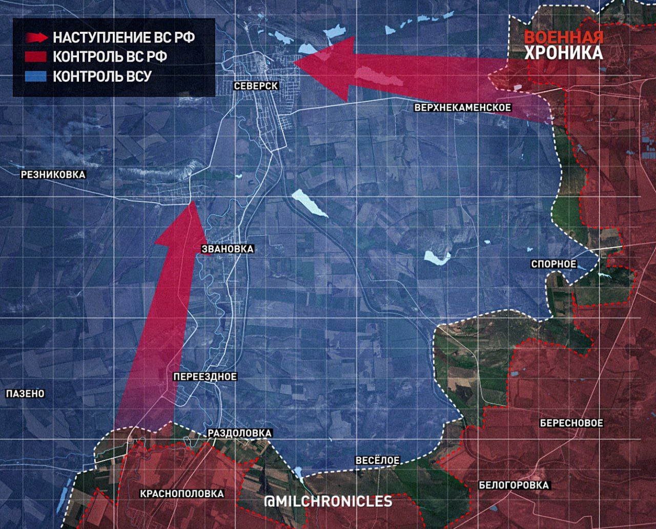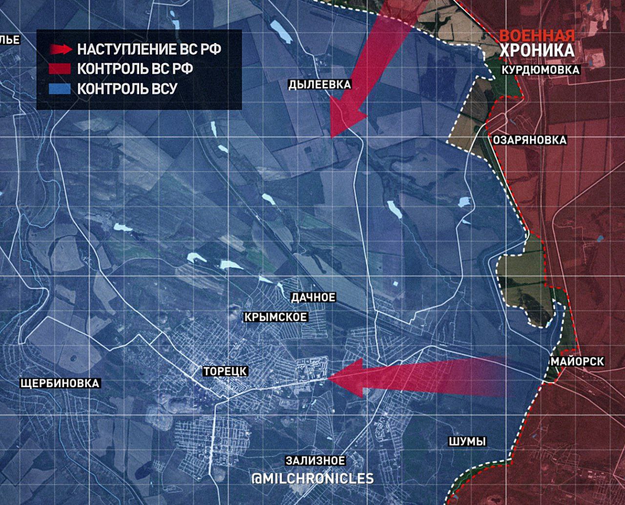 Второе направление — Торецк. С начала боёв за Артёмовск ВСУ перебрасывают в этот район большое количество резервов. По своим размерам город превышает Бахмут, однако находится неудобно для обороняющихся — на склоне крупного холма. Отсюда ВСУ пытались контратаковать позиции ЧВК «Вагнер» и ВС РФ в районе Озеряновки, южнее Артёмовска.