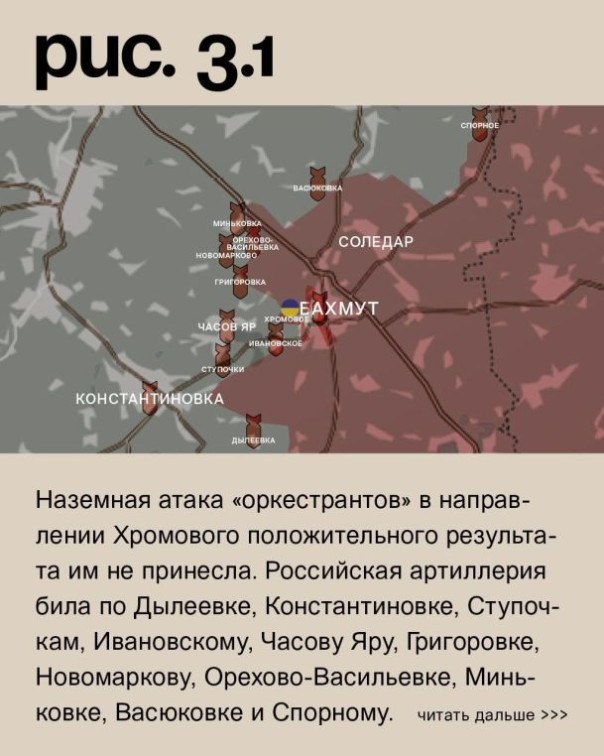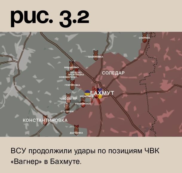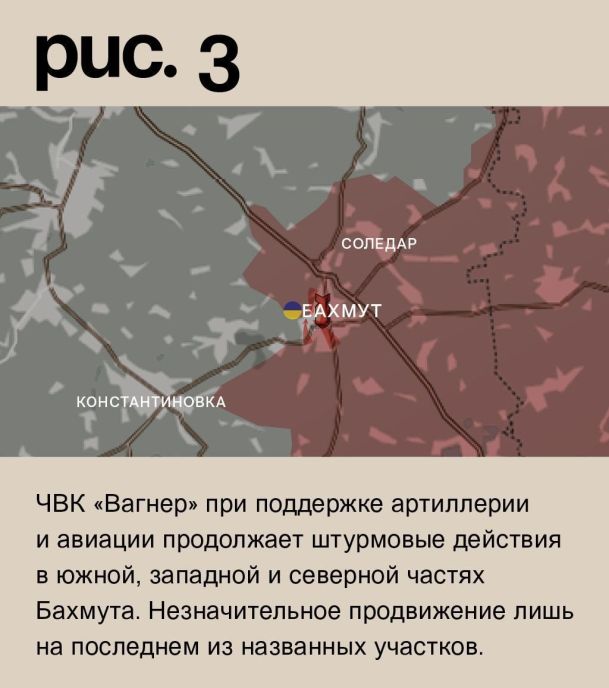ЧВК «Вагнер» при поддержке артиллерии и авиации продолжает штурмовые действия в южной, западной и северной частях Бахмута. Незначительное продвижение лишь на последнем из названных участков. Наземная атака «оркестрантов» в направлении Хромового положительного результата им не принесла. Российская артиллерия била по Дылеевке, Константиновке, Ступочкам, Ивановскому, Часову Яру, Григоровке, Новомаркову, Орехово-Васильевке, Миньковке, Васюковке и Спорному. ВСУ продолжили удары по позициям ЧВК «Вагнер» в Бахмуте. (Рис. 3)