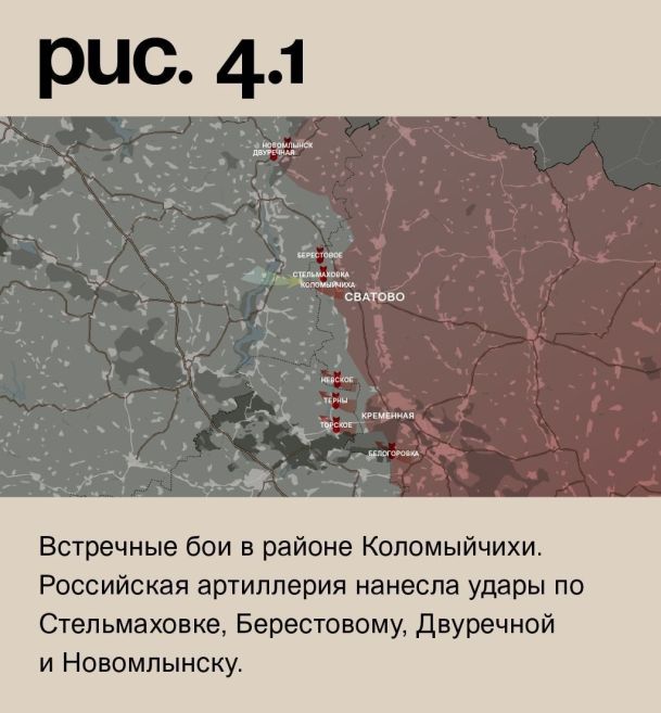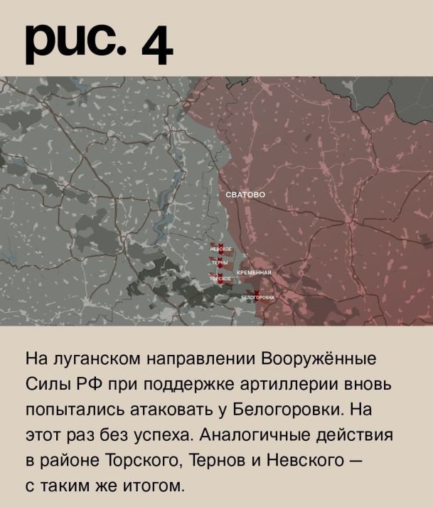 На луганском направлении Вооружённые Силы РФ при поддержке артиллерии вновь попытались атаковать у Белогоровки. На этот раз без успеха. Аналогичные действия в районе Торского, Тернов и Невского – с таким же итогом. Встречные бои в районе Коломыйчихи. Российская артиллерия нанесла удары по Стельмаховке, Берестовому, Двуречной и Новомлынску. (Рис. 4)