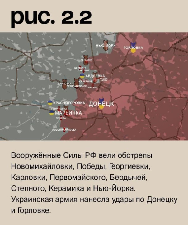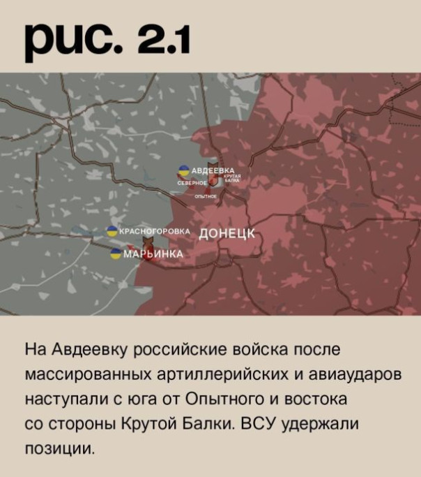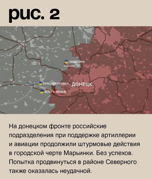 На донецком фронте российские подразделения при поддержке артиллерии и авиации продолжили штурмовые действия в городской черте Марьинки. Без успехов. Попытка продвинуться в районе Северного также оказалась неудачной. На Авдеевку российские войска после массированных артиллерийских и авиаударов наступали с юга от Опытного и востока со стороны Крутой Балки. ВСУ удержали позиции. Вооружённые Силы РФ вели обстрелы Новомихайловки, Победы, Георгиевки, Карловки, Первомайского, Бердычей, Степного, Керамика и Нью-Йорка. Украинская армия нанесла удары по Донецку и Горловке. (Рис. 2)