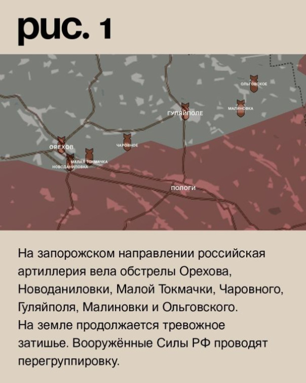 На запорожском направлении российская артиллерия вела обстрелы Орехова, Новоданиловки, Малой Токмачки, Чаровного, Гуляйполя, Малиновки и Ольговского. На земле продолжается тревожное затишье. Вооружённые Силы РФ проводят перегруппировку. (Рис. 1)