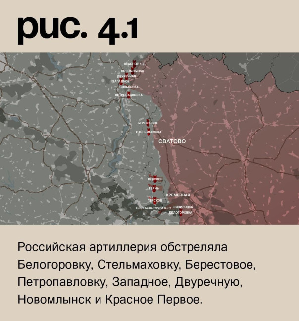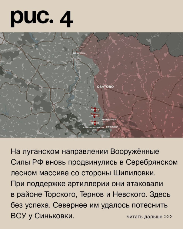 На луганском направлении Вооружённые Силы РФ вновь продвинулись в Серебрянском лесном массиве со стороны Шипиловки. При поддержке артиллерии они атаковали в районе Торского, Тернов и Невского. Здесь без успеха. Севернее им удалось потеснить ВСУ у Синьковки. Российская артиллерия обстреляла Белогоровку, Стельмаховку, Берестовое, Петропавловку, Западное, Двуречную, Новомлынск и Красное Первое. (Рис. 4)
