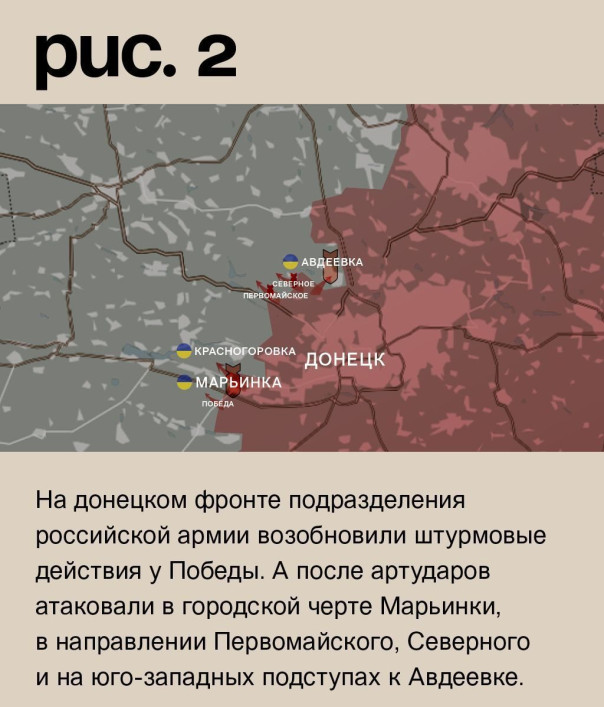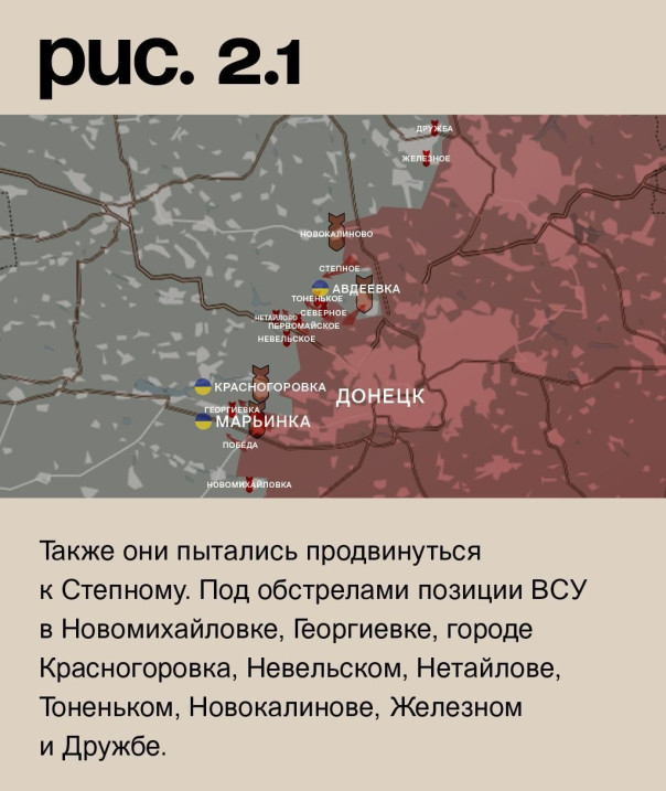 На донецком фронте подразделения российской армии возобновили штурмовые действия у Победы. А после артударов атаковали в городской черте Марьинки, в направлении Первомайского, Северного и на юго-западных подступах к Авдеевке. Также они пытались продвинуться к Степному. Под обстрелами позиции ВСУ в Новомихайловке, Георгиевке, городе Красногоровка, Невельском, Нетайлове, Тоненьком, Новокалинове, Железном и Дружбе. (Рис. 2)