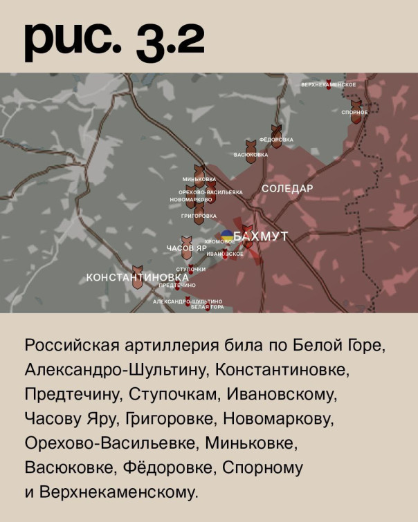 В Бахмуте ЧВК «Вагнер» при поддержке артиллерии и авиации продолжает штурмовые действия в южной, западной и северной части города. Продвижение есть на последнем из перечисленных участков. Также «оркестранты» предприняли мощную наземную атаку на Хромовое. Здесь ВСУ удерживают позиции. Российская артиллерия била по Белой Горе, Александро-Шультину, Константиновке, Предтечину, Ступочкам, Ивановскому, Часову Яру, Григоровке, Новомаркову, Орехово-Васильевке, Миньковке, Васюковке, Фёдоровке, Спорному и Верхнекаменскому. (Рис. 3)