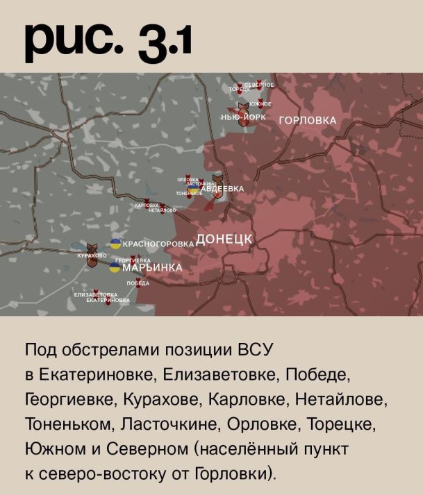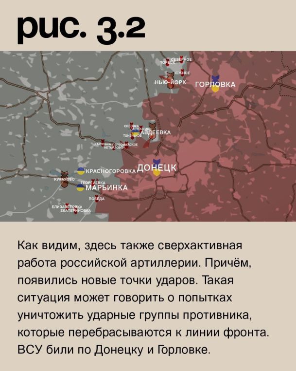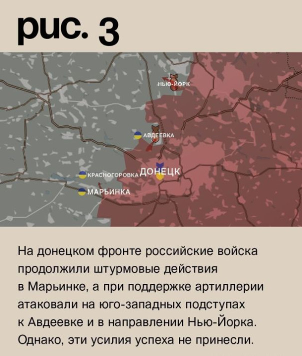 На донецком фронте российские войска продолжили штурмовые действия в Марьинке, а при поддержке артиллерии атаковали на юго-западных подступах к Авдеевке и в направлении Нью-Йорка. Однако, эти усилия успеха не принесли. Под обстрелами позиции ВСУ в Екатериновке, Елизаветовке, Победе, Георгиевке, Курахове, Карловке, Нетайлове, Тоненьком, Ласточкине, Орловке, Торецке, Южном и Северном (населённый пункт к северо-востоку от Горловки). Как видим, здесь также сверхактивная работа российской артиллерии. Причём, появились новые точки ударов. Такая ситуация может говорить о попытках уничтожить ударные группы противника, которые перебрасываются к линии фронта. ВСУ били по Донецку и Горловке. (Рис. 3)