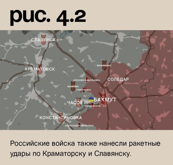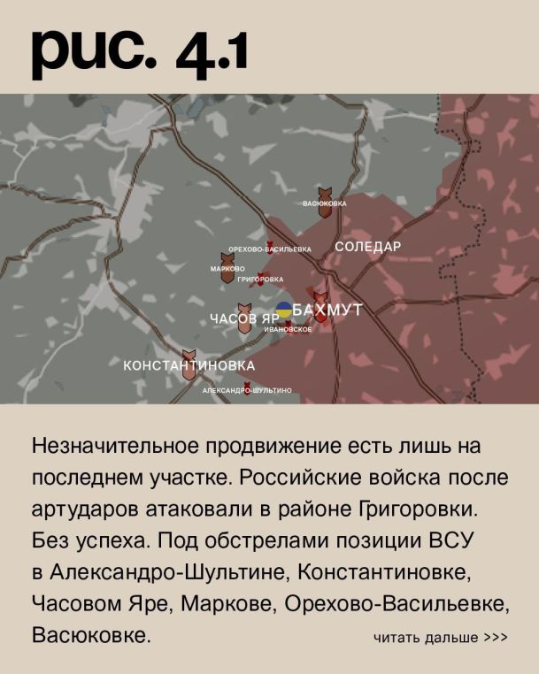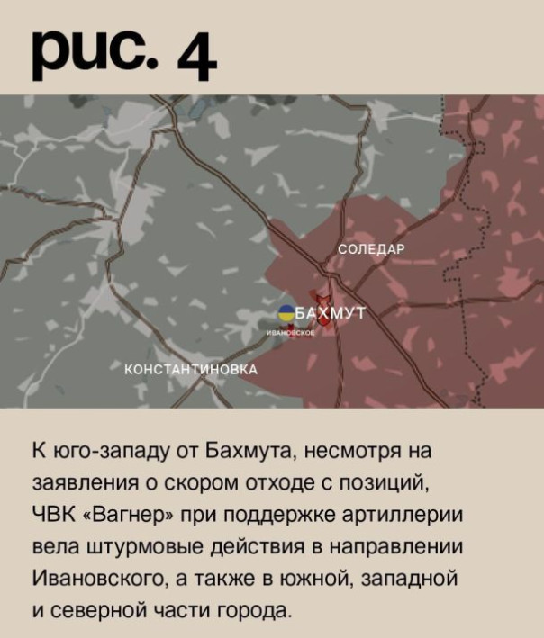 К юго-западу от Бахмута, несмотря на заявления о скором отходе с позиций, ЧВК «Вагнер» при поддержке артиллерии вела штурмовые действия в направлении Ивановского, а также в южной, западной и северной части города. Незначительное продвижение есть лишь на последнем участке. Российские войска после артударов атаковали в районе Григоровки. Без успеха. Под обстрелами позиции ВСУ в Александро-Шультине, Константиновке, Часовом Яре, Маркове, Орехово-Васильевке, Васюковке. Российские войска также нанесли ракетные удары по Краматорску и Славянску. (Рис.4)
