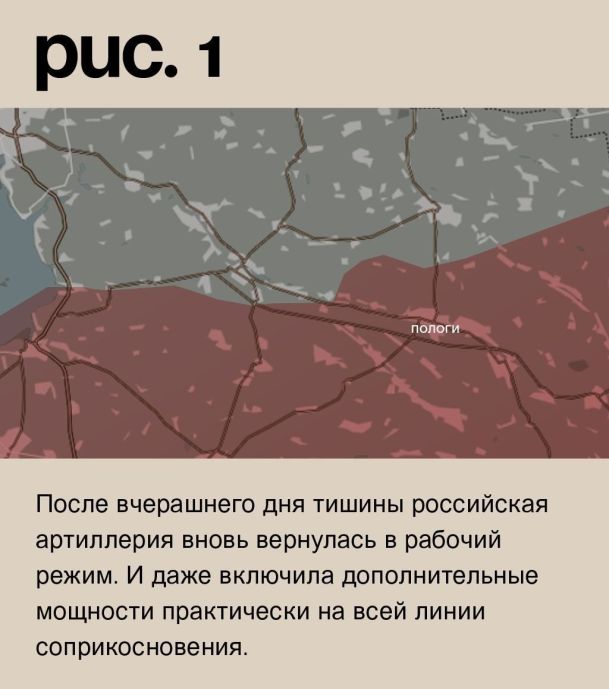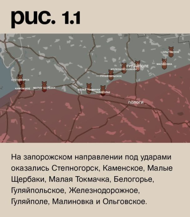 После вчерашнего дня тишины российская артиллерия вновь вернулась в рабочий режим. И даже включила дополнительные мощности практически на всей линии соприкосновения. На запорожском направлении под ударами оказались Степногорск, Каменское, Малые Щербаки, Малая Токмачка, Белогорье, Гуляйпольское, Железнодорожное, Гуляйполе, Малиновка и Ольговское. (Рис. 1)