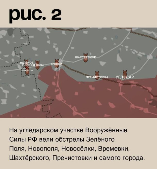 На угледарском участке Вооружённые Силы РФ вели обстрелы Зелёного Поля, Новополя, Новосёлки, Времевки, Шахтёрского, Пречистовки и самого города. (Рис. 2)