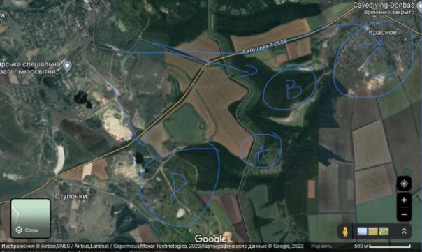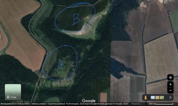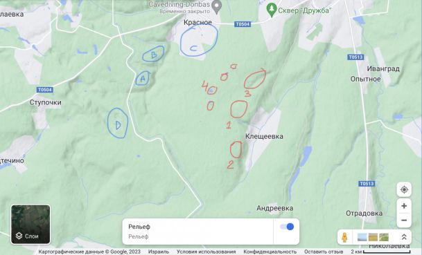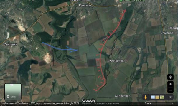 Позиция (она будет обозначена синяя А) удобна для обороны от атаки со стороны Клещеевки, но удержать ее в текущих условиях российским войскам было невозможно.