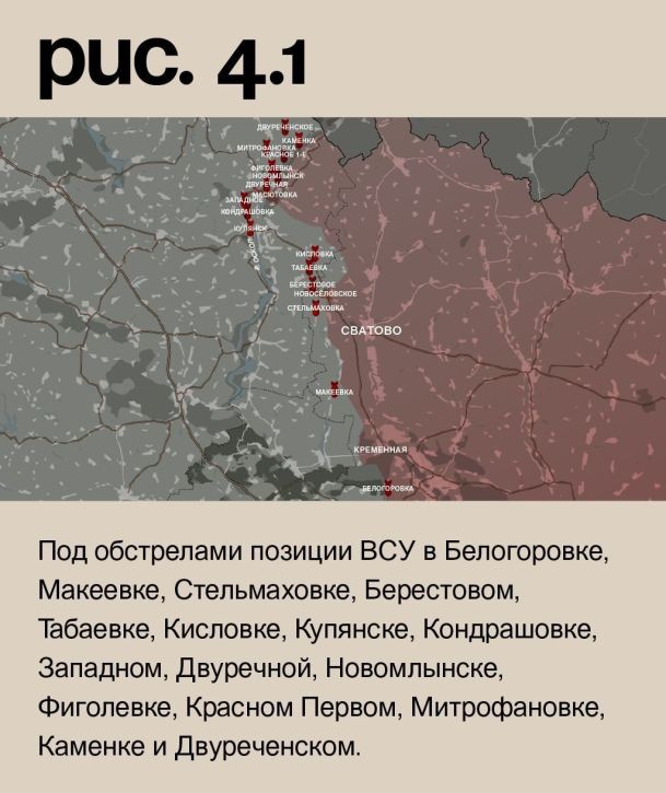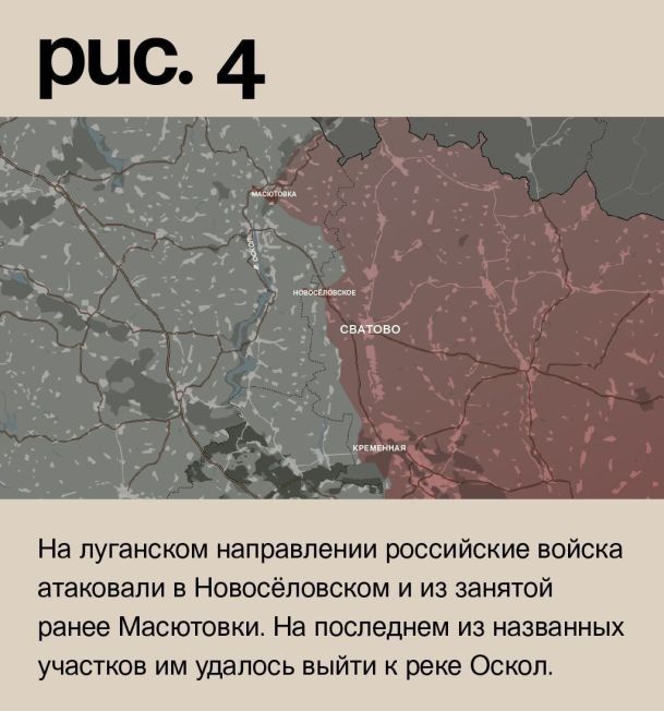 На луганском направлении российские войска атаковали в Новосёловском и из занятой ранее Масютовки. На последнем из названных участков им удалось выйти к реке Оскол. Под обстрелами позиции ВСУ в Белогоровке, Макеевке, Стельмаховке, Берестовом, Табаевке, Кисловке, Купянске, Кондрашовке, Западном, Двуречной, Новомлынске, Фиголевке, Красном Первом, Митрофановке, Каменке и Двуреченском. (Рис. 4)