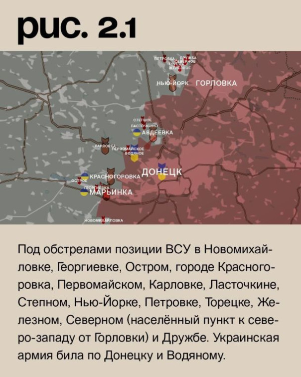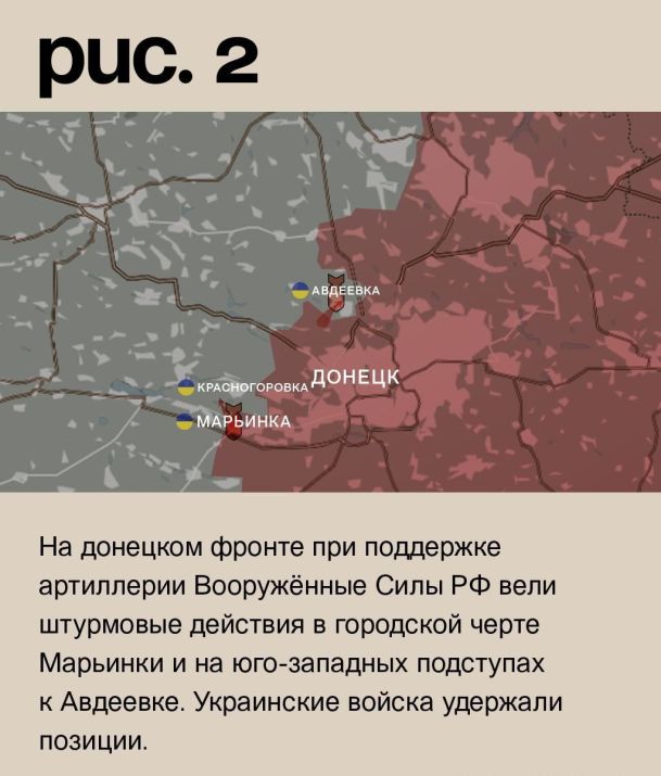 На донецком фронте при поддержке артиллерии Вооружённые Силы РФ вели штурмовые действия в городской черте Марьинки и на юго-западных подступах к Авдеевке. Украинские войска удержали позиции. Под обстрелами позиции ВСУ в Новомихайловке, Георгиевке, Остром, городе Красногоровка, Первомайском, Карловке, Ласточкине, Степном, Нью-Йорке, Петровке, Торецке, Железном, Северном (населённый пункт к северо-западу от Горловки) и Дружбе. Украинская армия била по Донецку и Водяному. (Рис. 2)