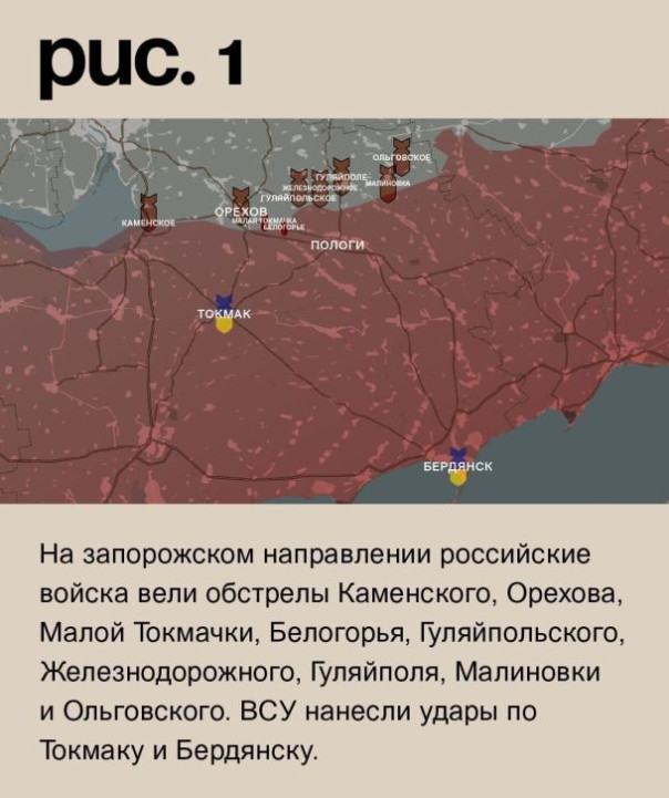 На запорожском направлении российские войска вели обстрелы Каменского, Орехова, Малой Токмачки, Белогорья, Гуляйпольского, Железнодорожного, Гуляйполя, Малиновки и Ольговского. ВСУ нанесли удары по Токмаку и Бердянску. (Рис. 1)