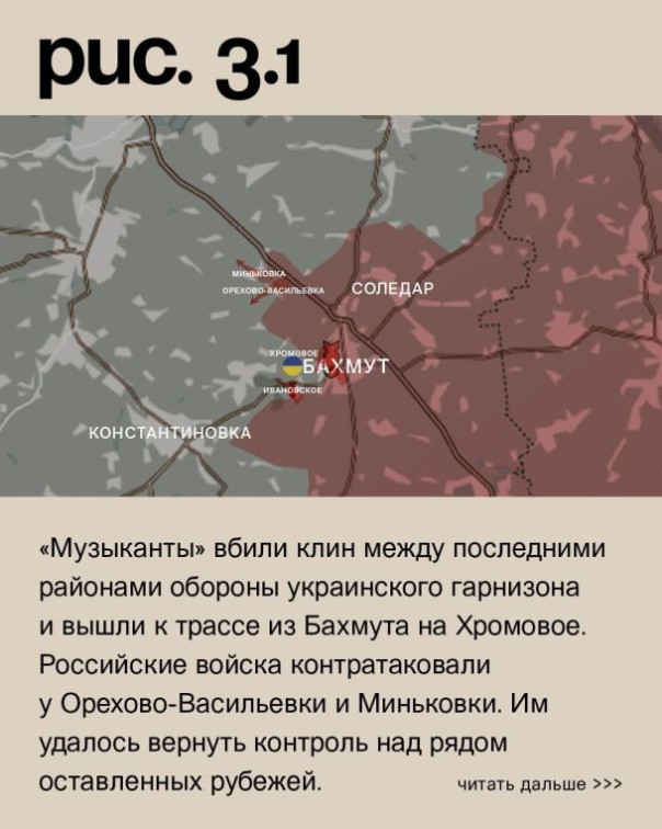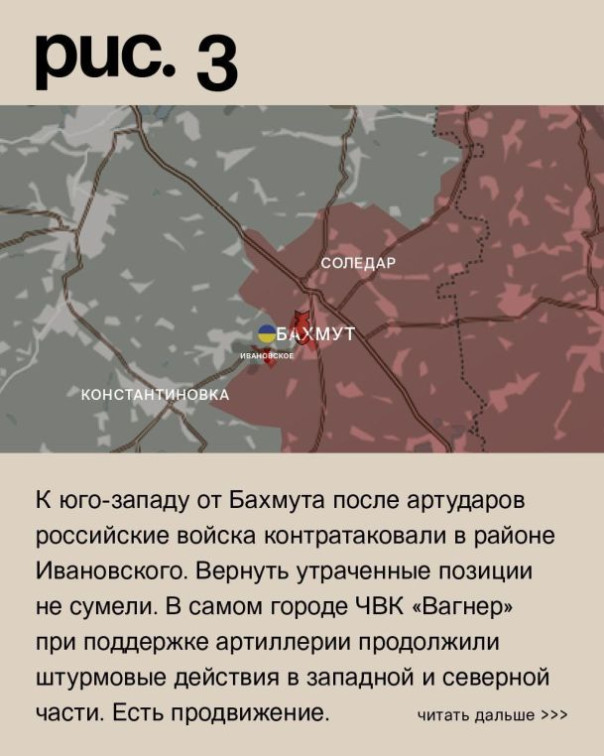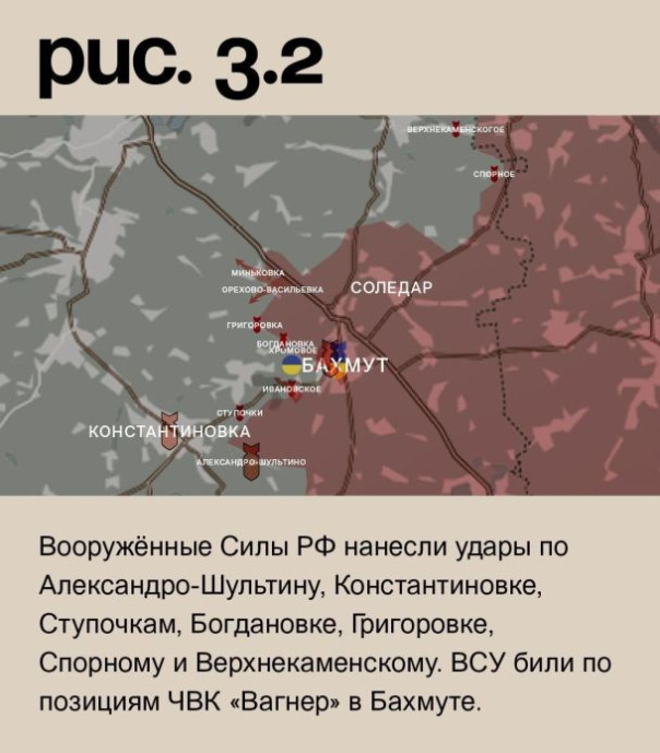 К юго-западу от Бахмута после артударов российские войска контратаковали в районе Ивановского. Вернуть утраченные позиции не сумели. В самом городе ЧВК «Вагнер» при поддержке артиллерии продолжили штурмовые действия в западной и северной части. Есть продвижение. «Музыканты» вбили клин между последними районами обороны украинского гарнизона и вышли к трассе из Бахмута на Хромовое. Российские войска контратаковали у Орехово-Васильевки и Миньковки. Им удалось вернуть контроль над рядом оставленных рубежей. Вооружённые Силы РФ нанесли удары по Александро-Шультину, Константиновке, Ступочкам, Богдановке, Григоровке, Спорному и Верхнекаменскому. ВСУ били по позициям ЧВК «Вагнер» в Бахмуте. (Рис. 3)