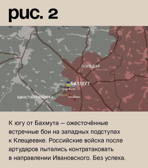 К югу от Бахмута – ожесточённые встречные бои на западных подступах к Клещеевке. Российские войска после артударов пытались контратаковать в направлении Ивановского. Без успеха. В самом Бахмуте ЧВК «Вагнер» при поддержке артиллерии продолжила штурм последних позиций украинского гарнизона на окраинах города с запада и севера. К северу от Соледара ВСУ атакуют в районе Сакко и Ванцетти. Это «мёртвое» село представляет для обеих противоборствующих сторон живой интерес с точки зрения логистики. Российские войска обстреливали Белую Гору, Предтечино, Часов Яр, Богдановку, Григоровку, Новомарково, Орехово-Васильевку, Васюковку, Весёлое, Спорное и Верхнекаменское. Украинская армия била по Курдюмовке, подконтрольным ЧВК «Вагнер» районам Бахмута и Железнянскому. (Рис. 2)