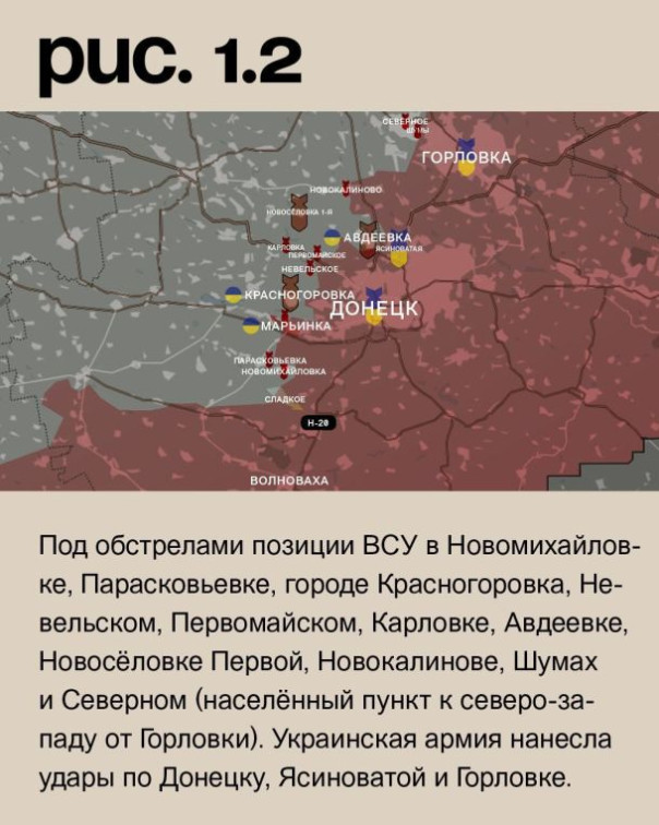 На донецком фронте ВСУ вели наступательные действия в направлении Сладкого. Больше года в этой зоне активных боевых действий не было. Таким образом, украинские войска стремятся выйти к участку трассы Н-20, который идёт на Волноваху. ВС РФ вновь проявили активность в Марьинке, где при поддержке артиллерии продолжили штурмовые действия. Под обстрелами позиции ВСУ в Новомихайловке, Парасковьевке, городе Красногоровка, Невельском, Первомайском, Карловке, Авдеевке, Новосёловке Первой, Новокалинове, Шумах и Северном (населённый пункт к северо-западу от Горловки). ВСУ нанесли удары по Донецку, Ясиноватой и Горловке. (Рис. 1)