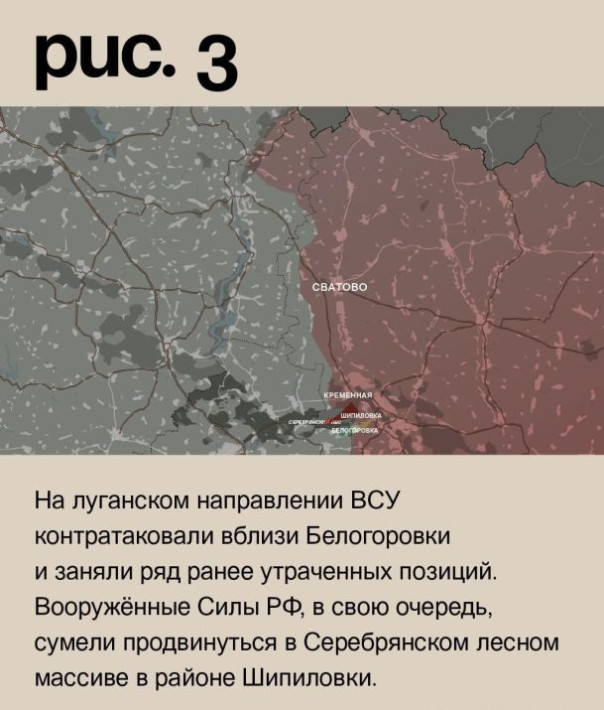 На луганском направлении ВСУ контратаковали вблизи Белогоровки и заняли ряд ранее утраченных позиций. ВС РФ, в свою очередь, сумели продвинуться в Серебрянском лесном массиве в районе Шипиловки. При поддержке артиллерии российские войска вели наступательные действия у Невского и Макеевки. Также они предприняли наземную атаку в Новосёловском. Под обстрелами позиции ВСУ в Белогоровке, Торском, Стельмаховке, Берестовом, Табаевке, Кисловке, Западном, Двуречной, Новомлынске, Фиголевке и Красном Первом. (Рис. 3)