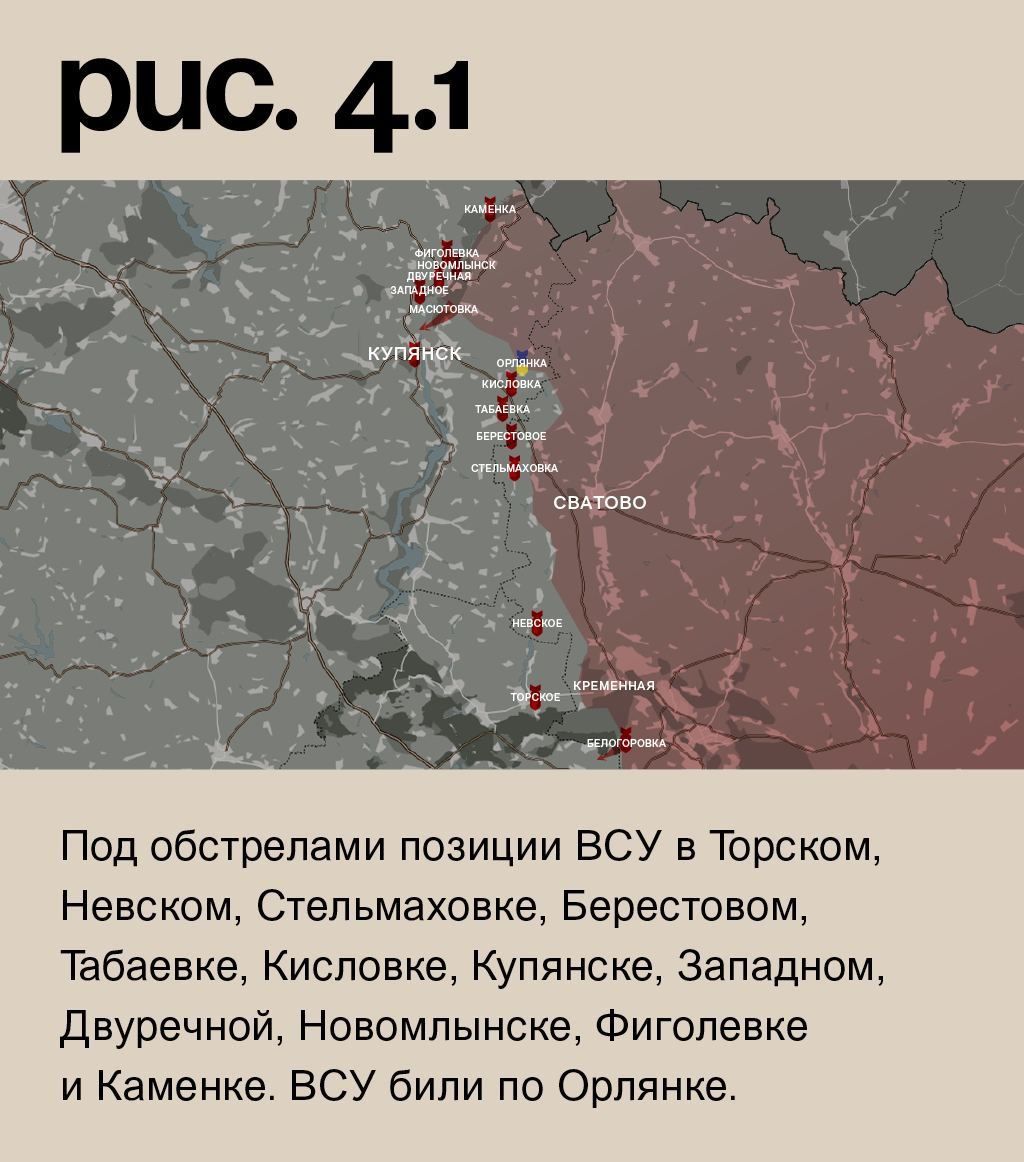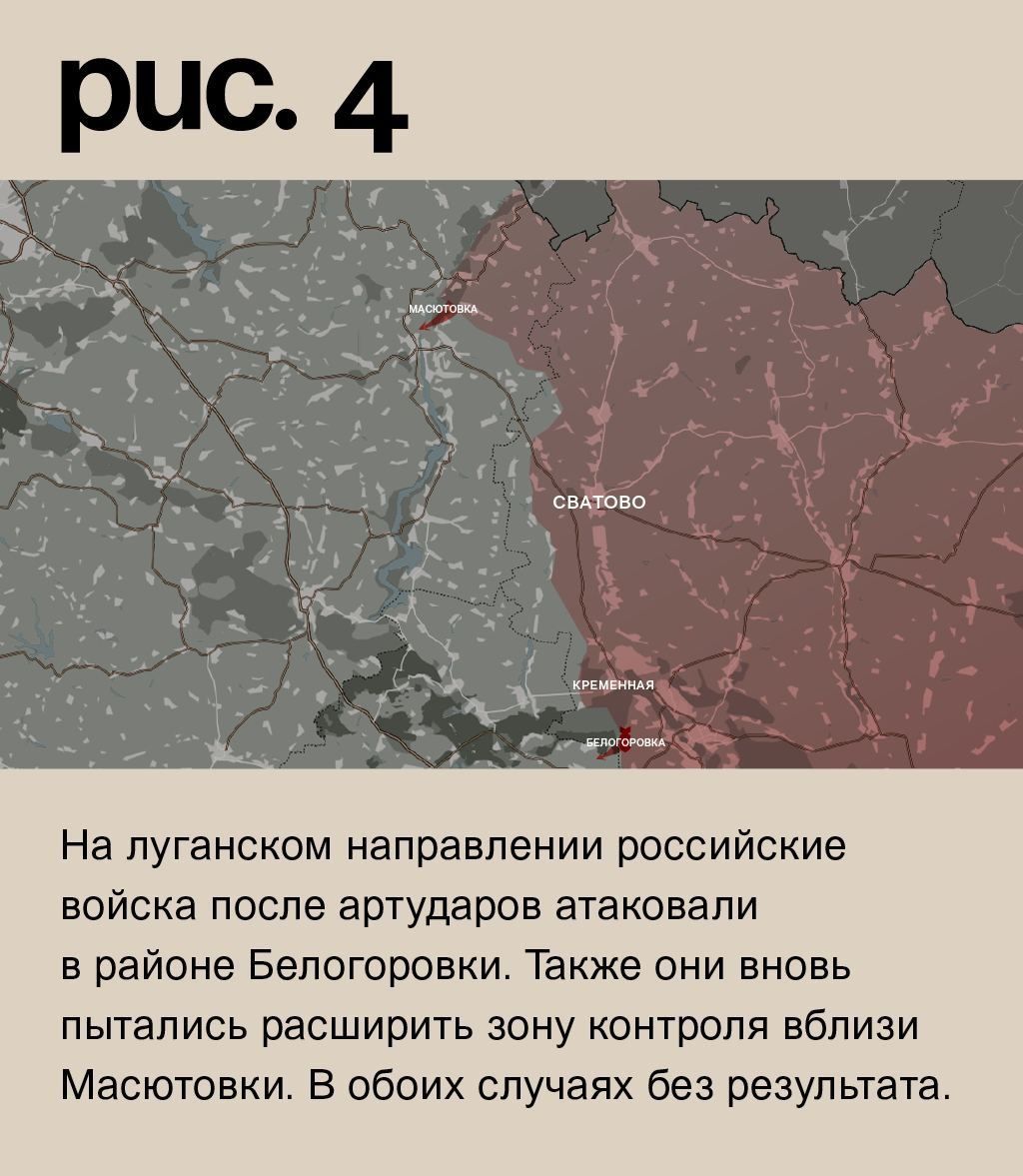 На луганском направлении российские войска после артударов атаковали в районе Белогоровки. Также они вновь пытались расширить зону контроля вблизи Масютовки. В обоих случаях без результата. Под обстрелами позиции ВСУ в Торском, Невском, Стельмаховке, Берестовом, Табаевке, Кисловке, Купянске, Западном, Двуречной, Новомлынске, Фиголевке и Каменке. ВСУ били по Орлянке. (Рис. 4)