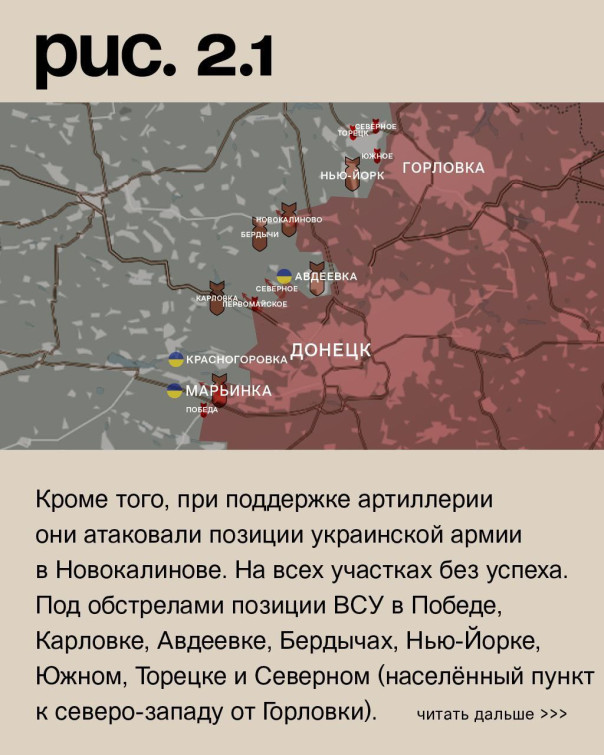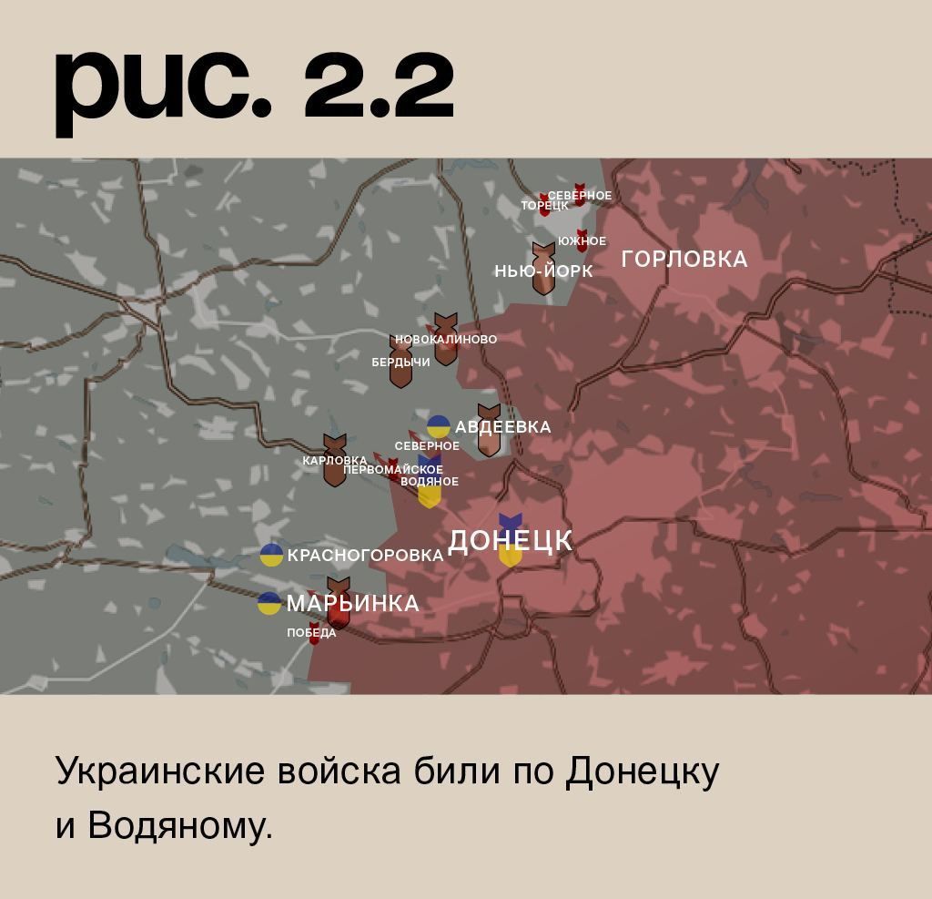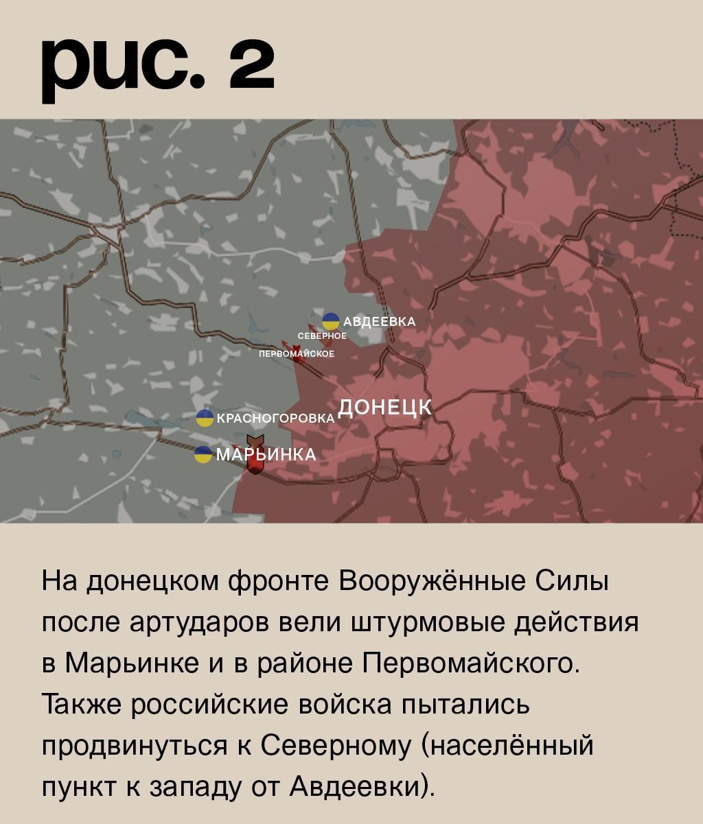 На донецком фронте Вооружённые Силы после артударов вели штурмовые действия в Марьинке и в районе Первомайского. Также российские войска пытались продвинуться к Северному (населённый пункт к западу от Авдеевки). Кроме того, при поддержке артиллерии они атаковали позиции украинской армии в Новокалинове. На всех участках без успеха. Под обстрелами позиции ВСУ в Победе, Карловке, Авдеевке, Бердычах, Нью-Йорке, Южном, Торецке и Северном (населённый пункт к северо-западу от Горловки). Украинские войска били по Донецку и Водяному. (Рис. 2)