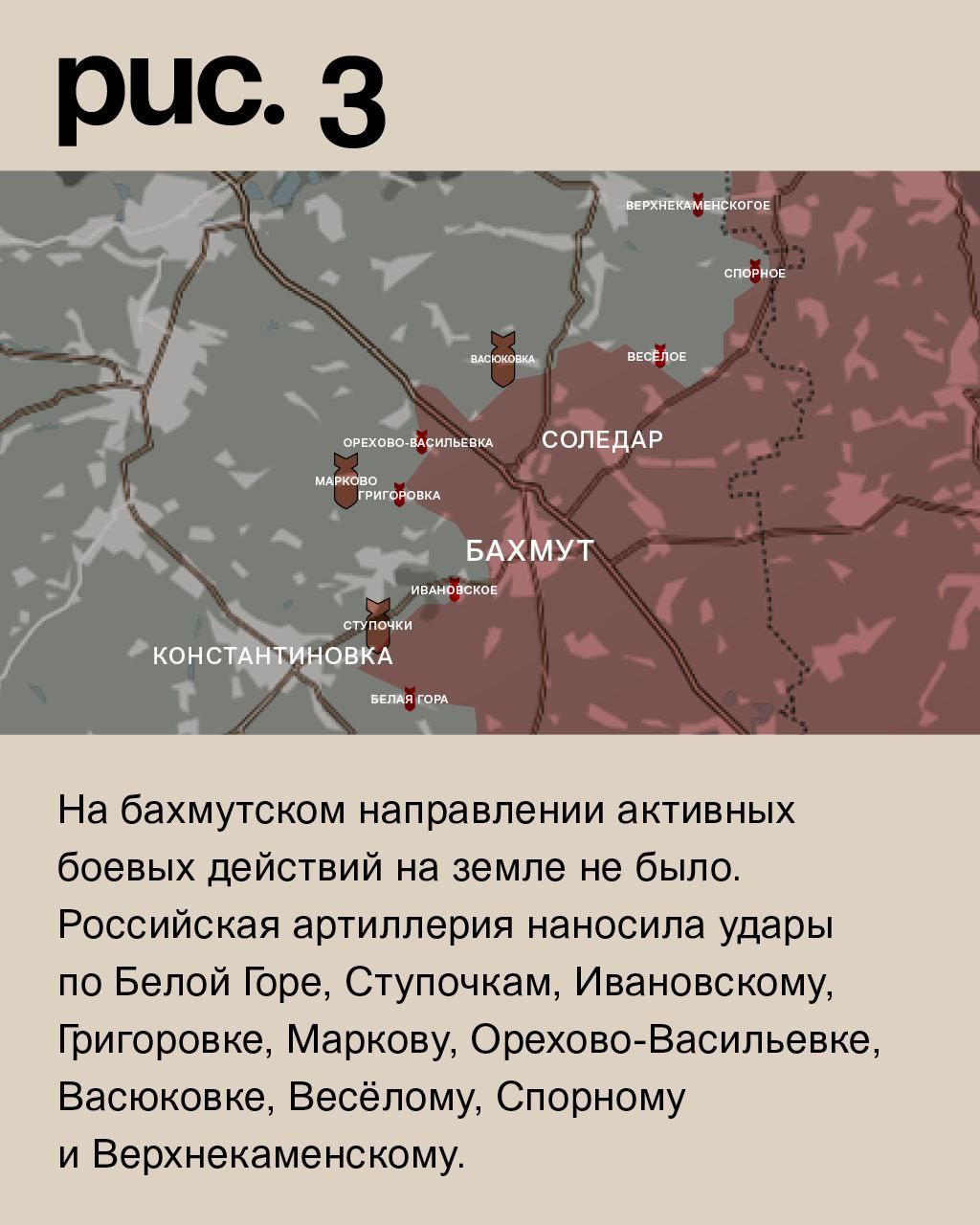 На бахмутском направлении активных боевых действий на земле не было. Российская артиллерия наносила удары по Белой Горе, Ступочкам, Ивановскому, Григоровке, Маркову, Орехово-Васильевке, Васюковке, Весёлому, Спорному и Верхнекаменскому. (Рис. 3)
