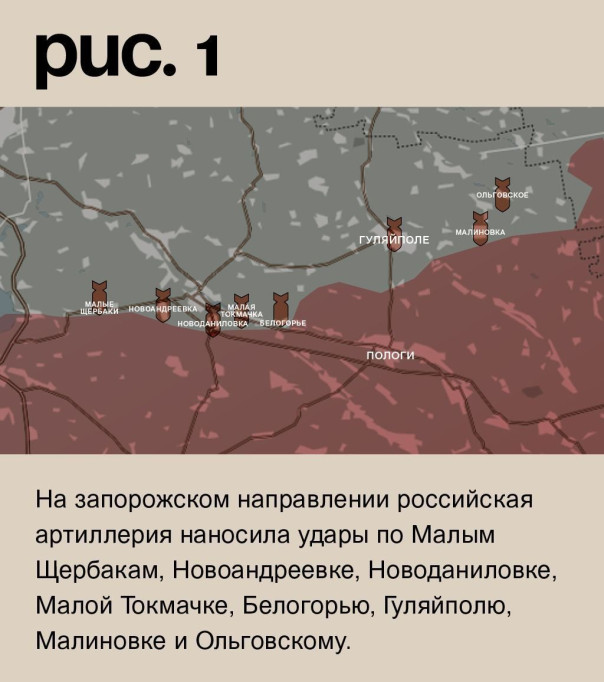 На запорожском направлении российская артиллерия наносила удары по Малым Щербакам, Новоандреевке, Новоданиловке, Малой Токмачке, Белогорью, Гуляйполю, Малиновке и Ольговскому. (Рис. 1)