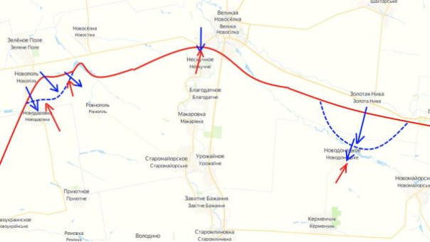 Наступление противника на запад от Великой Новоселки на сегодня, похоже, уже выдохлось. Сейчас контратакуют ВС РФ (пытаются даже отбить утерянные вчера позиции). Плотно работает артиллерия и авиация.