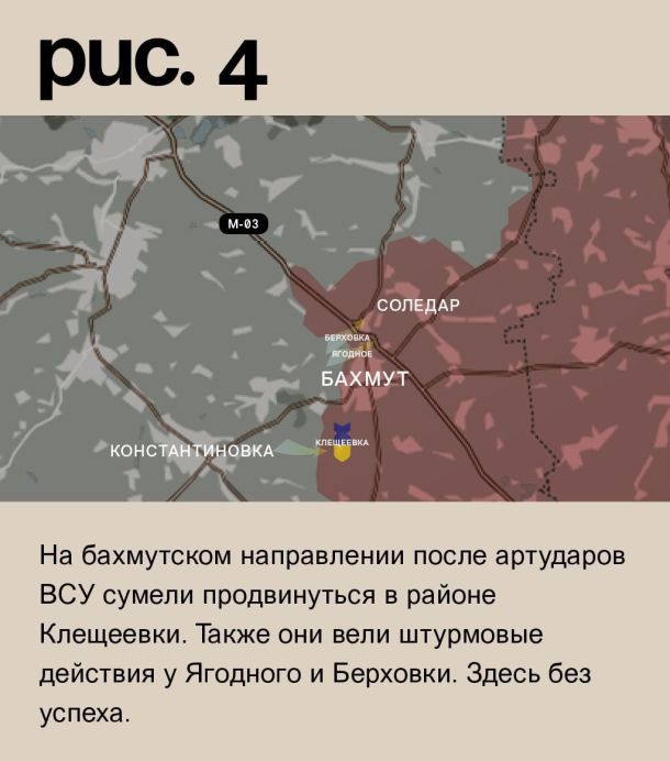 На бахмутском направлении после артударов ВСУ сумели продвинуться в районе Клещеевки. Также они вели штурмовые действия у Ягодного и Берховки. Здесь без успеха. Российская артиллерия била по украинским подразделениям в Константиновке, Ивановском, Богдановке, Григоровке, Орехово-Васильевке, Васюковке, Спорном и Верхнекаменском. ВСУ вели обстрелы позиций Вооружённых Сил РФ в Бахмуте. (Рис. 4)