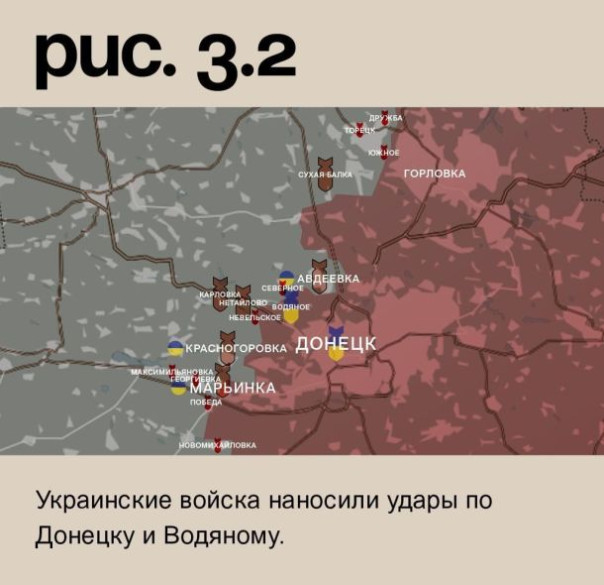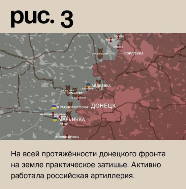 На всей протяжённости донецкого фронта на земле практическое затишье. Активно работала российская артиллерия. Под обстрелами позиции ВСУ в Новомихайловке, Победе, Марьинке, Георгиевке, Максимильяновке, городе Красногоровка, Невельском, Нетайлове, Карловке, Северном (населённый пункт к западу от Авдеевки), Авдеевке, Сухой Балке, Южном, Торецке и Дружбе. Украинские войска наносили удары по Донецку и Водяному. (Рис. 3)