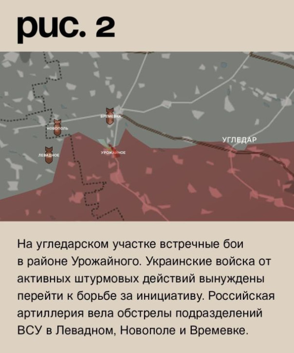 На угледарском участке встречные бои в районе Урожайного. Украинские войска от активных штурмовых действий вынуждены перейти к борьбе за инициативу. Российская артиллерия вела обстрелы подразделений ВСУ в Левадном, Новополе и Времевке. (Рис. 2)
