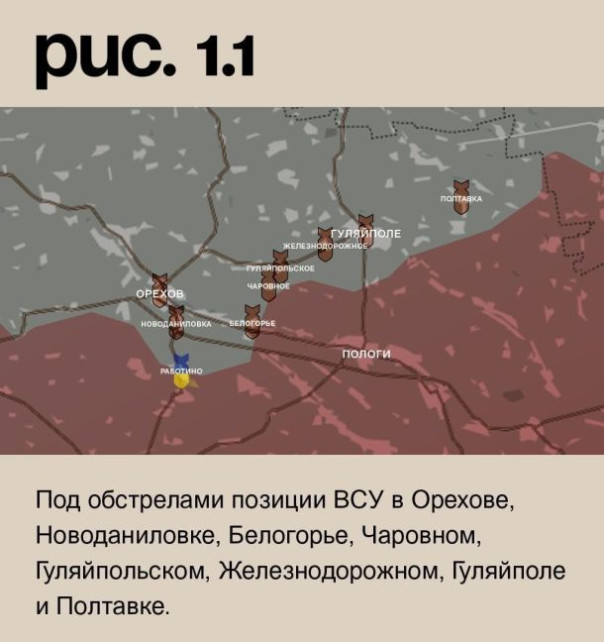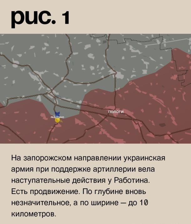 На запорожском направлении украинская армия при поддержке артиллерии вела наступательные действия у Работина. Есть продвижение. По глубине вновь незначительное, а по ширине – до 10 километров. Под обстрелами позиции ВСУ в Орехове, Новоданиловке, Белогорье, Чаровном, Гуляйпольском, Железнодорожном, Гуляйполе и Полтавке. (Рис. 1)